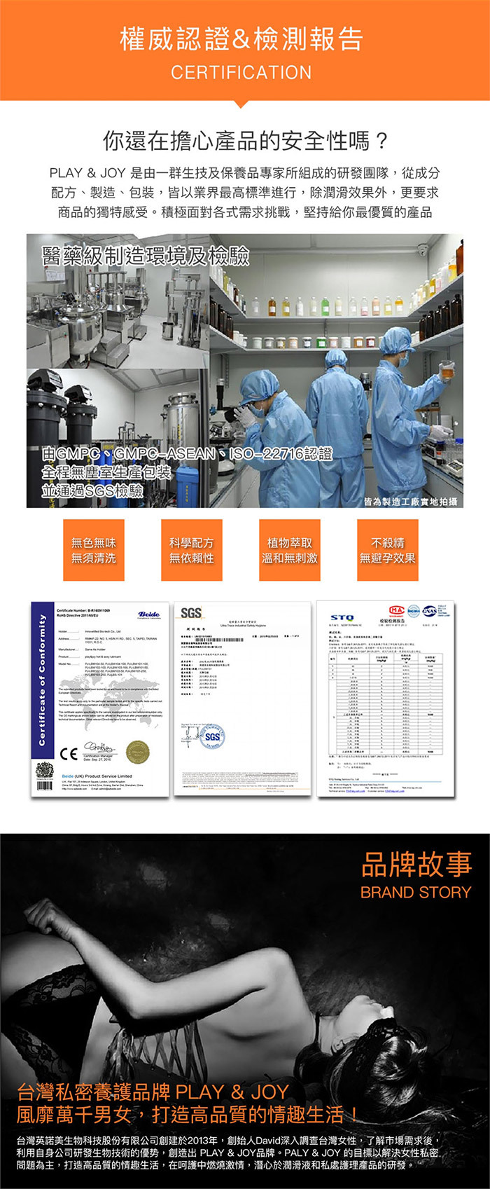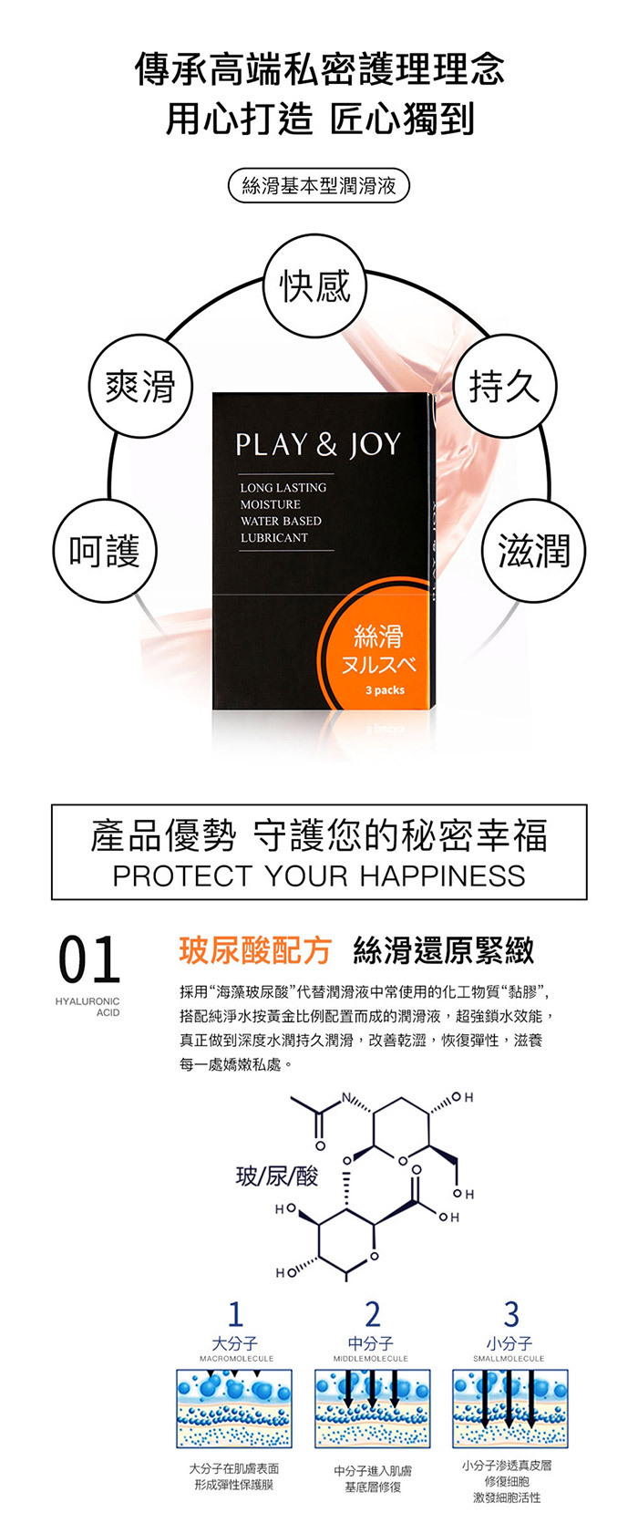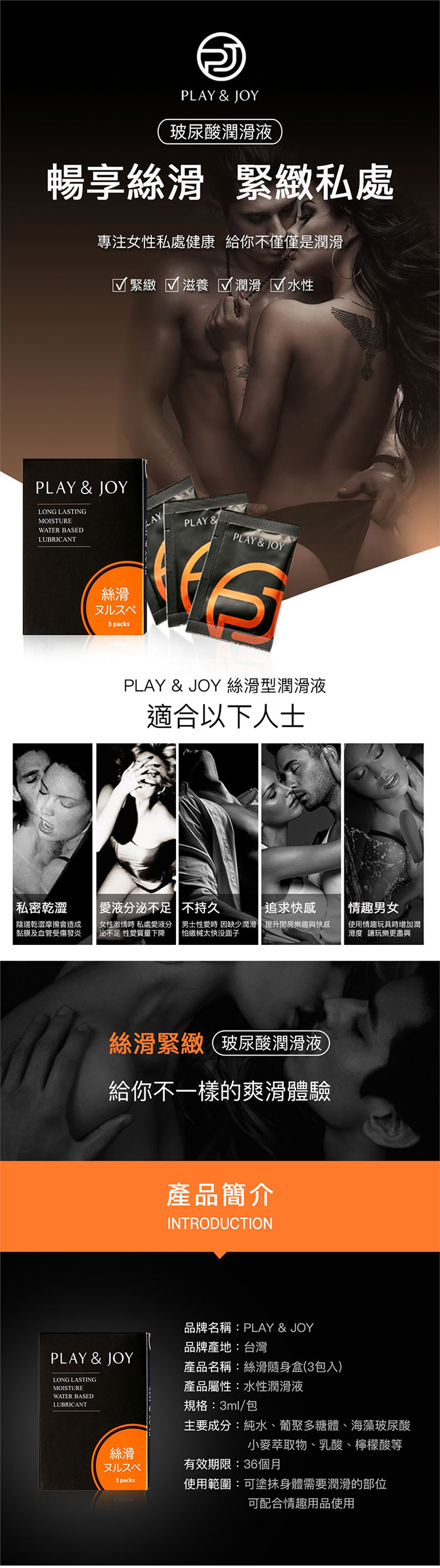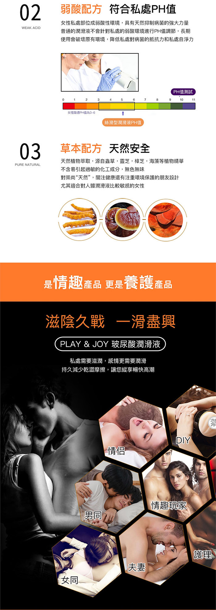 集安全、呵護、樂趣三合一的極致潤滑液!讓您,用過就愛上!極致潤滑 液採用PH5.5弱酸性與女性天然分泌液相近的特殊配方,使私密處保持 最佳狀態不產生惱人的異味或乾養不殊服!!並且擁有藍藻玻尿酸底液不 但兼具保養功能更能讓潤滑液有著Q彈感受喔~PLAY & JOY極致潤滑 液擁有化妝品等級保養品鎖水磁石可以長效潤滑,讓您樂趣不間斷~乾 燥後只需少量水份即可重現潤滑效果。清爽水溶性配方,無色無味。只 需簡單清水就可方便清洗無異味殘留~絲滑型擁有增強女性私密處的天 然免疫力,避免感染問題發生。隨身3入小包裝讓您外出也能方便攜帶 ,到哪都能享受舒適性愛喔~