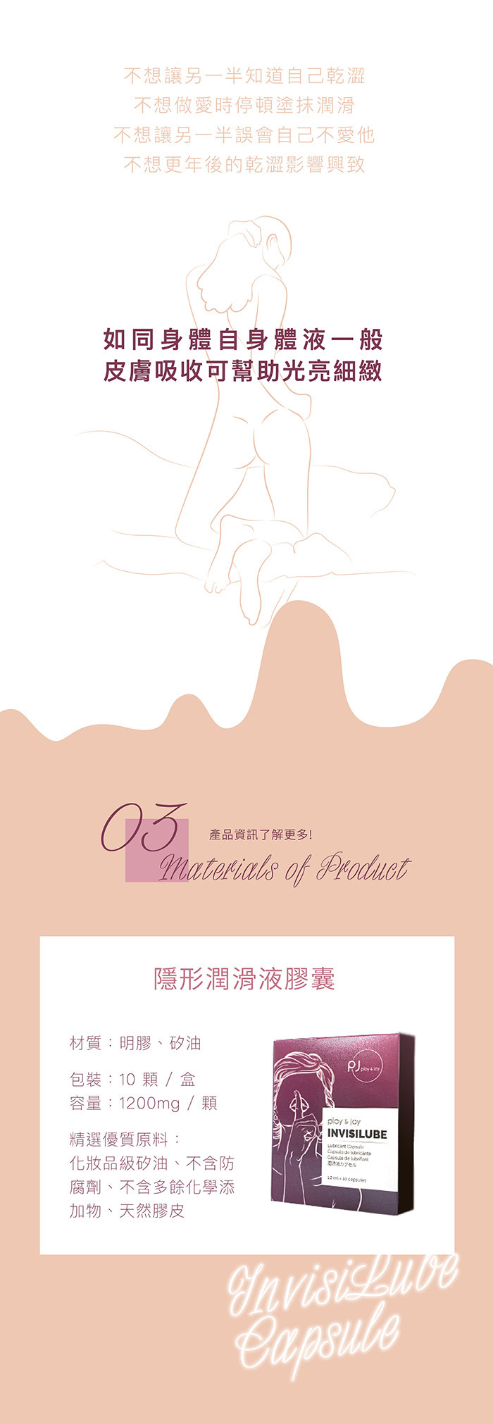 隱形膠囊潤滑液,如同自身體液,質地清爽絲滑、持久不乾,不黏膩好 清洗,皮膚吸收可幫助光亮細緻,避免乾澀讓激情變得尷尬,膠囊設計 隱密使用,化解尷尬,浪漫情境不中斷,攜帶便利,使用上方便衛生。