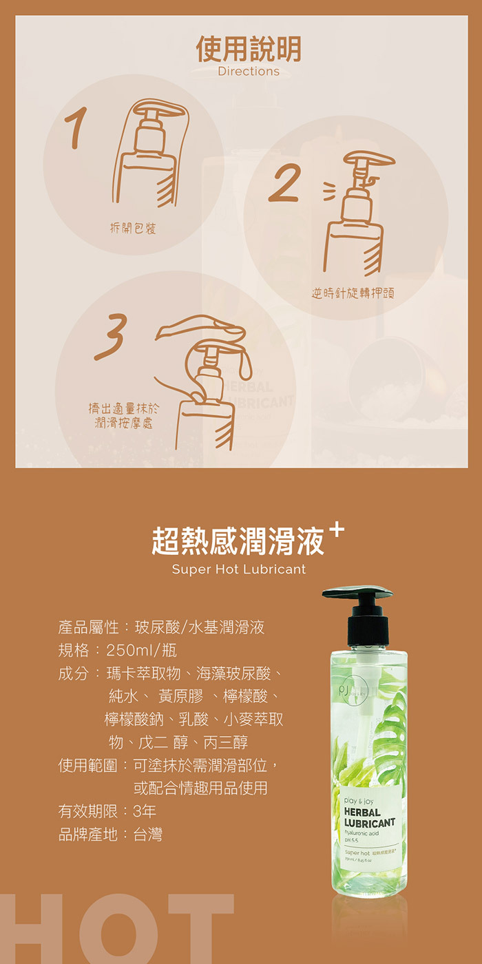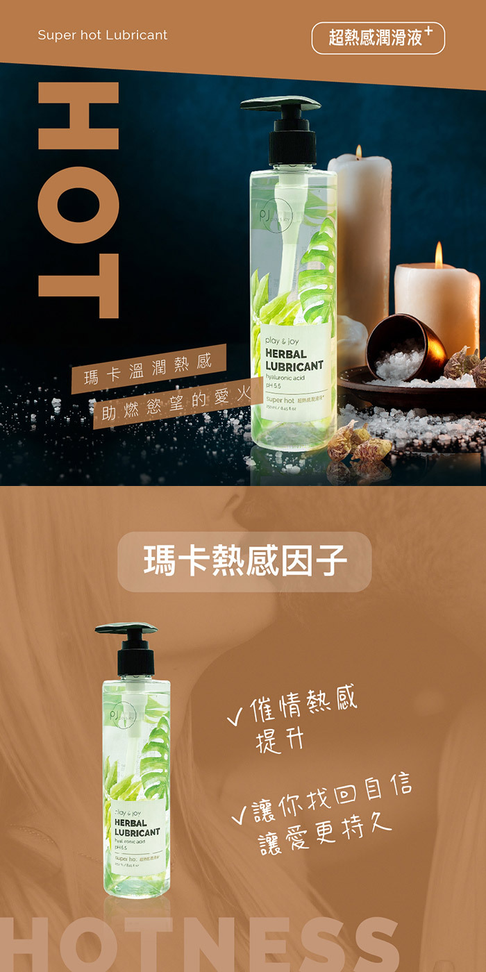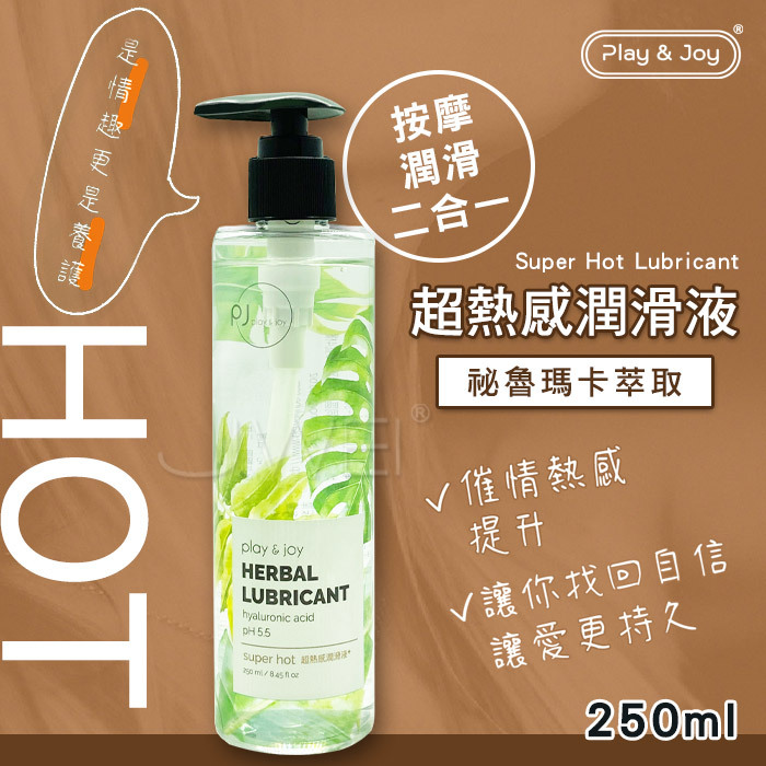 按摩、拉絲、Q滑二合一的超爽滑潤滑液!讓您,用過就會愛上!給您奢 華極致潤滑享受擁有藍藻玻尿酸底液不但兼具保養功能更能讓潤滑液有 著Q彈感受喔~PLAY & JOY超熱感滑潤滑液,瑪卡熱感因子點燃慾火 ,提升敏感度,擁有化妝品等級保養品鎖水磁石可以長效潤滑,讓您樂 趣不間斷~乾燥後只需少量水份即可重現潤滑效果。清爽水溶性草本配 方,無色無味。只需簡單清水就可方便清洗無異味殘留~加倍的厚實配 方讓您性愛更持久更好玩喔~