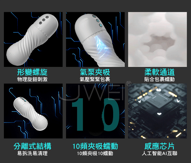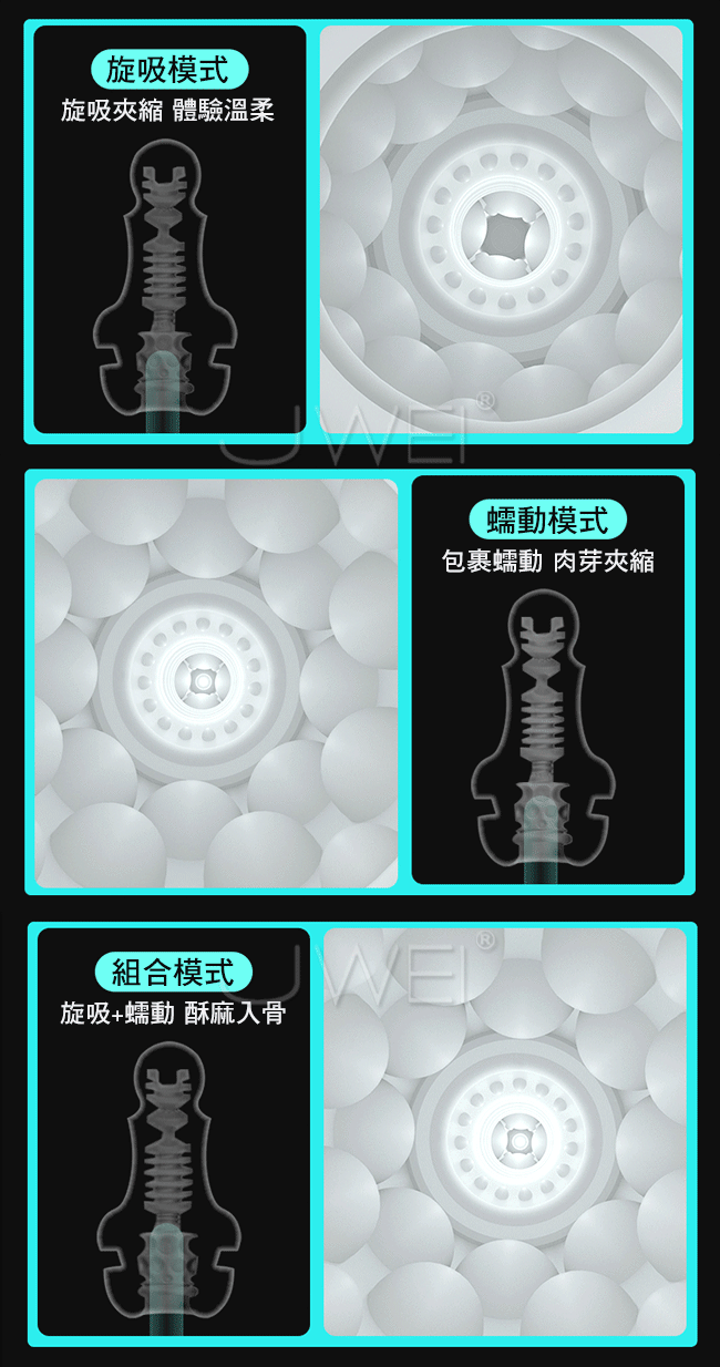 太空杯形變螺旋收縮讓您體驗看得見的收縮,氣泵螺旋夾吸設計將內部空間螺旋伸縮氣壓包裹。組合玩法刺激不重樣10頻旋吸10頻蠕動,每一下柔軟壓迫都讓你陷入無法逃離的情感旋渦~肉感Q彈軟膠蜜道,揉臀肉感貼身包裹打造女子觸感唷~