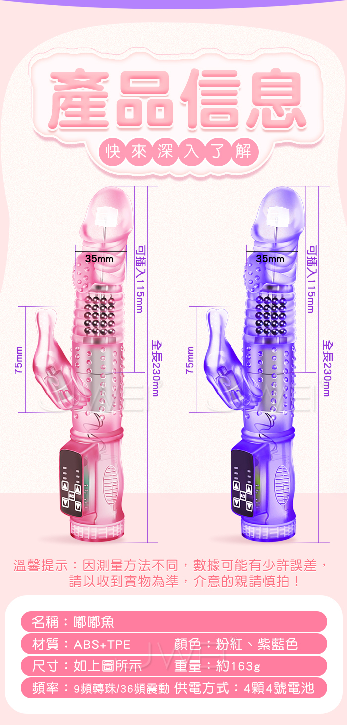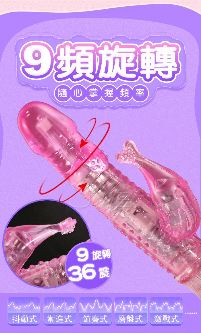 嘟嘟魚 ‧ 9段旋轉滾珠+36頻強震 顆粒螺紋內外刺激按摩棒-粉