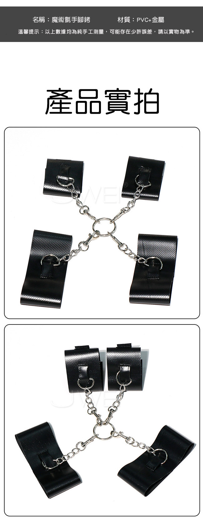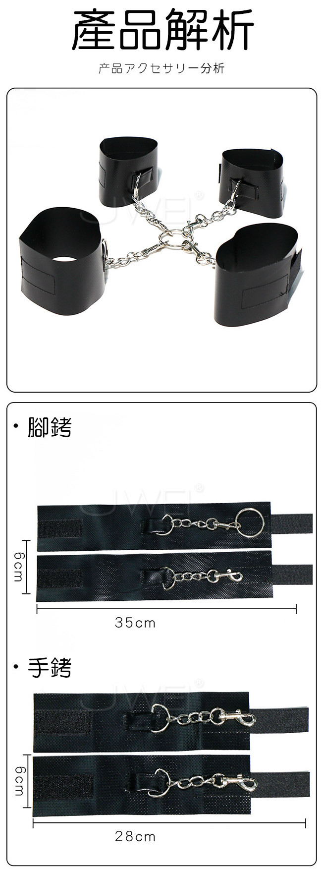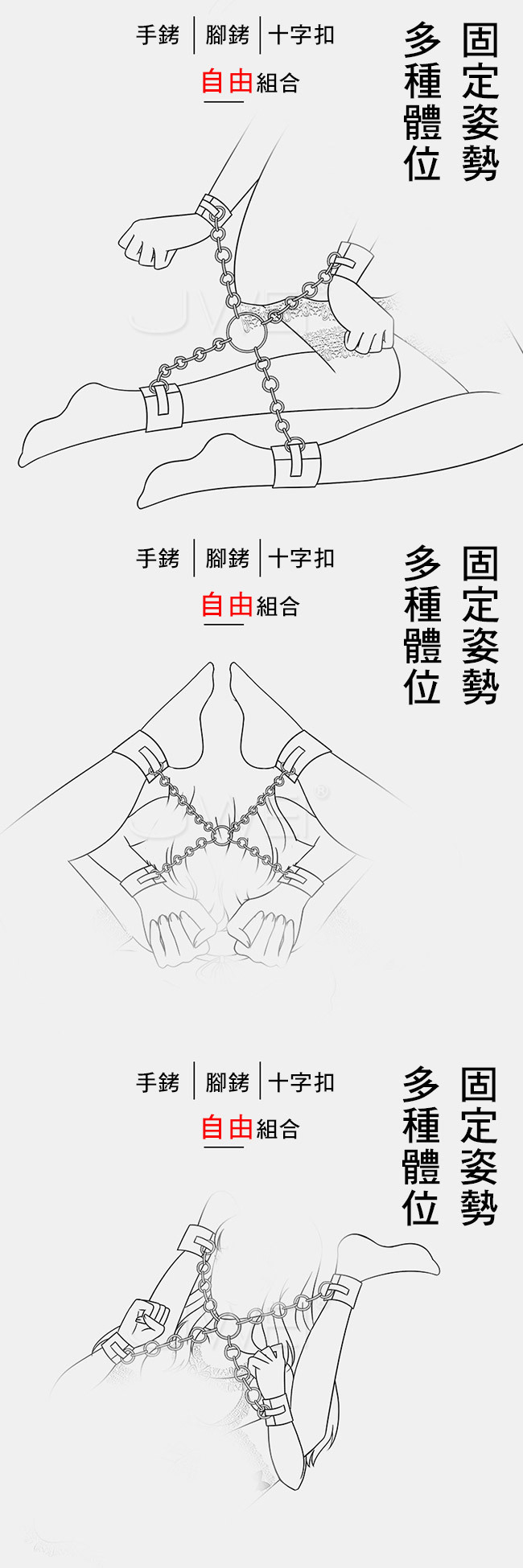 手銬腳銬、十字扣,自由組合,多種體位、固定姿勢;精緻扣環,牢固耐用;金屬鎖扣,自由裝卸手腳銬,鎖住羞恥;魔鬼氈,無痕緊貼反向袖口更牢固,挑起你的性慾用於性愛行動中,體驗不一樣的情趣.......