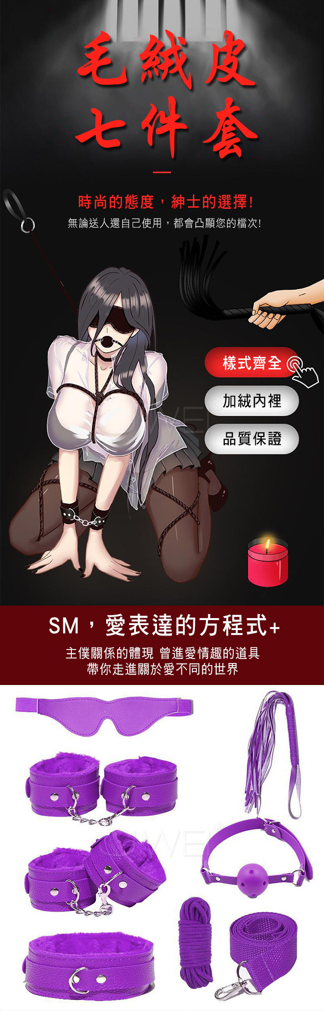 SM 捆綁套裝.7件組毛絨皮革捆綁調情用品-紫色(盒裝)