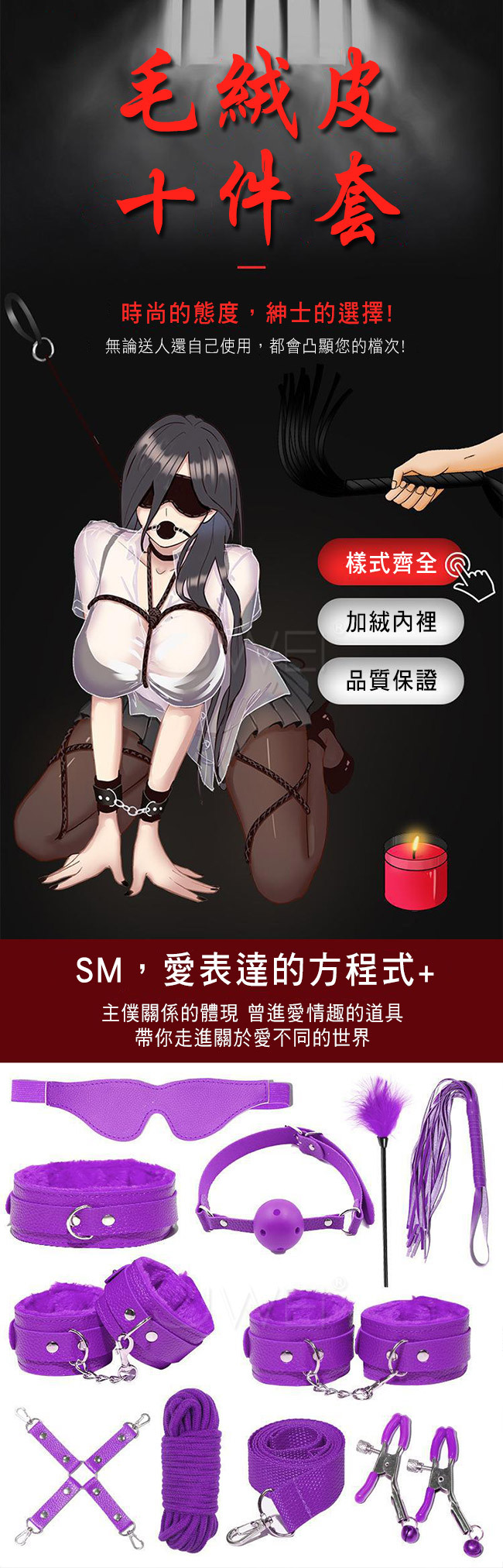 SM 捆綁套裝.10件組毛絨皮革捆綁調情用品-紫色(盒裝)