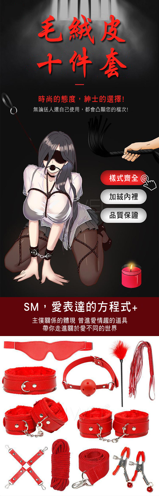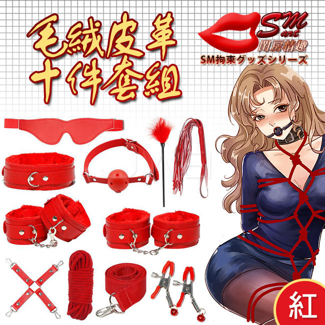 SM 捆綁套裝.10件組毛絨皮革捆綁調情用品-紅色(盒裝)