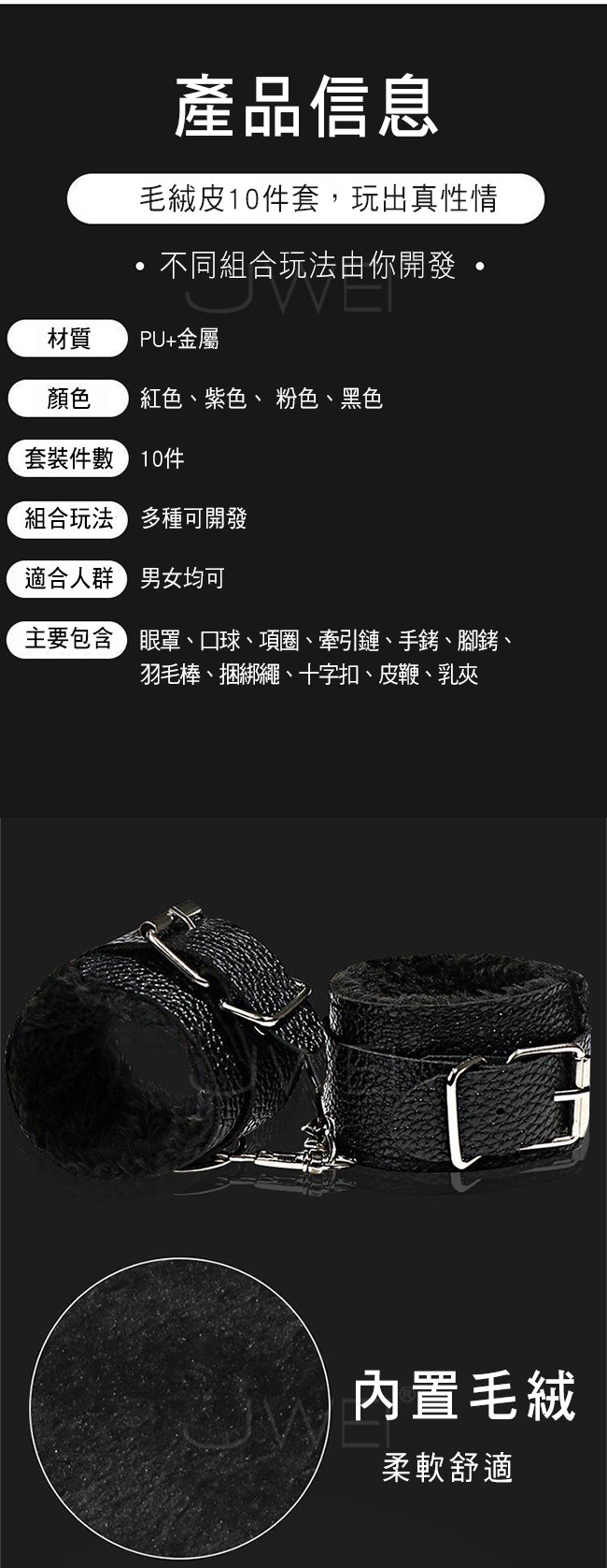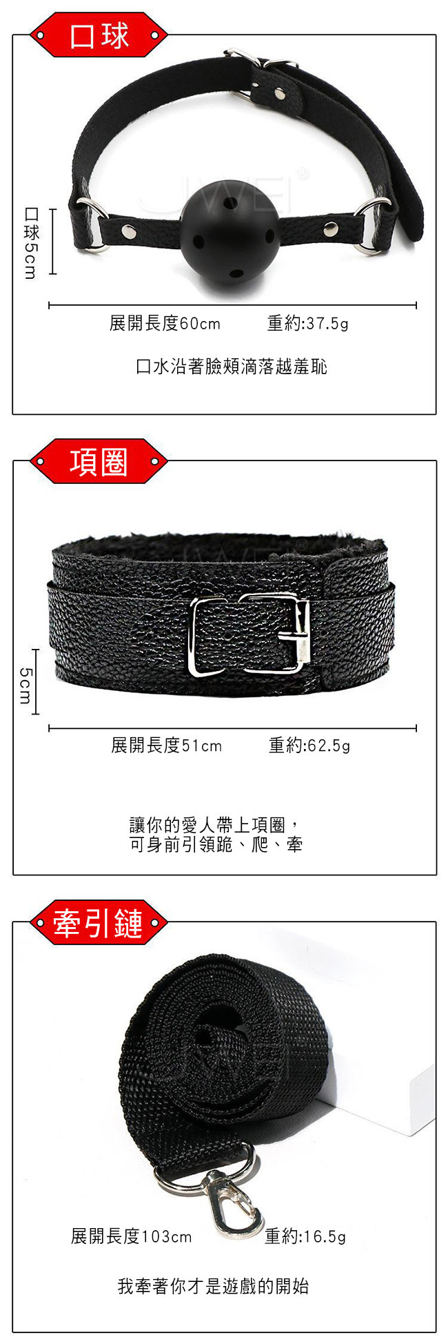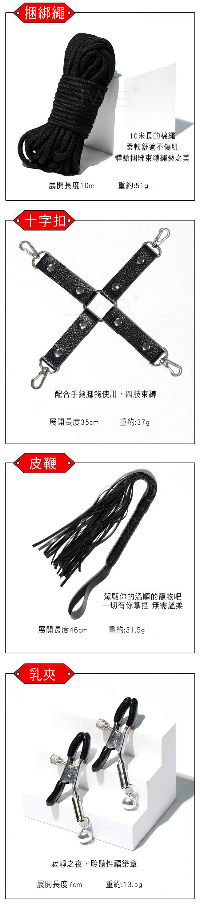 ■內容:眼罩、口球、項圈、牽引鏈、手銬、腳銬、 羽毛棒、捆綁繩、十字扣、皮鞭、乳夾