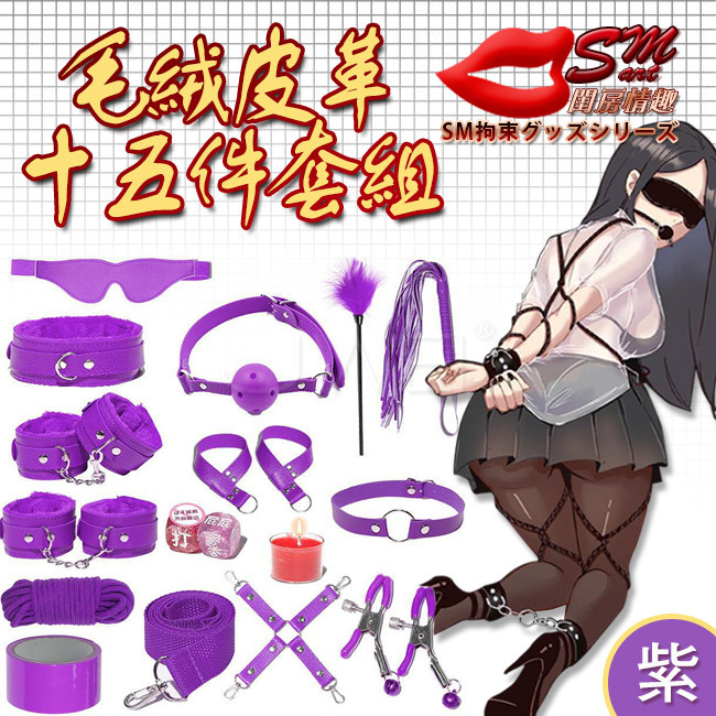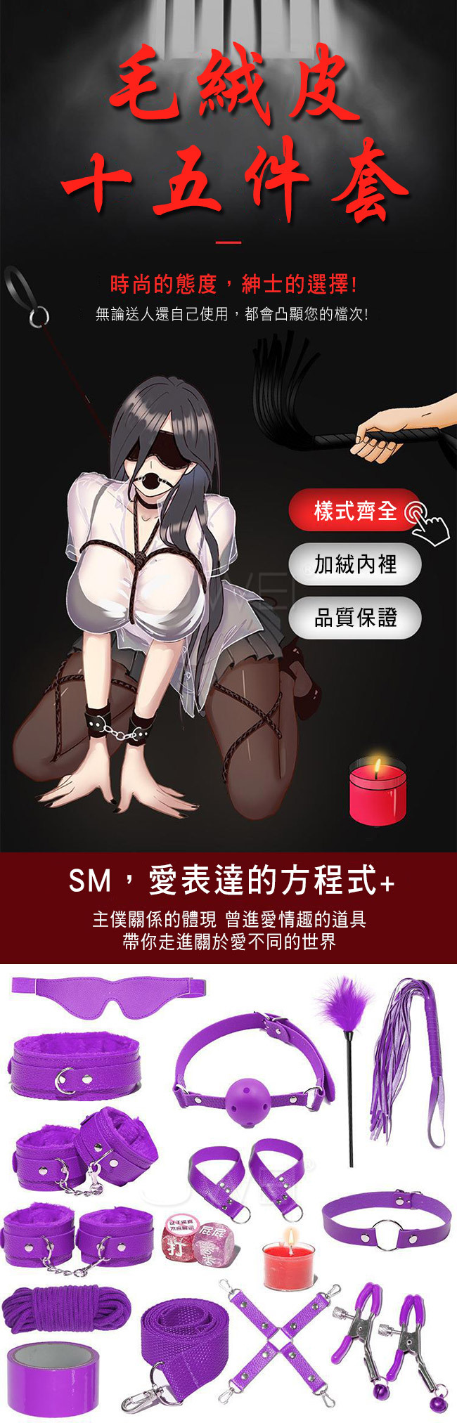 SM 捆綁套裝.15件組毛絨皮革捆綁調情用品-紫色(盒裝)