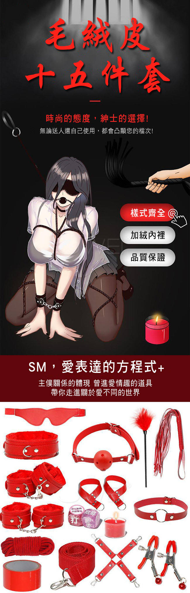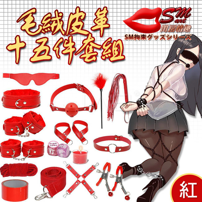 SM 捆綁套裝.15件組毛絨皮革捆綁調情用品-紅色(盒裝)