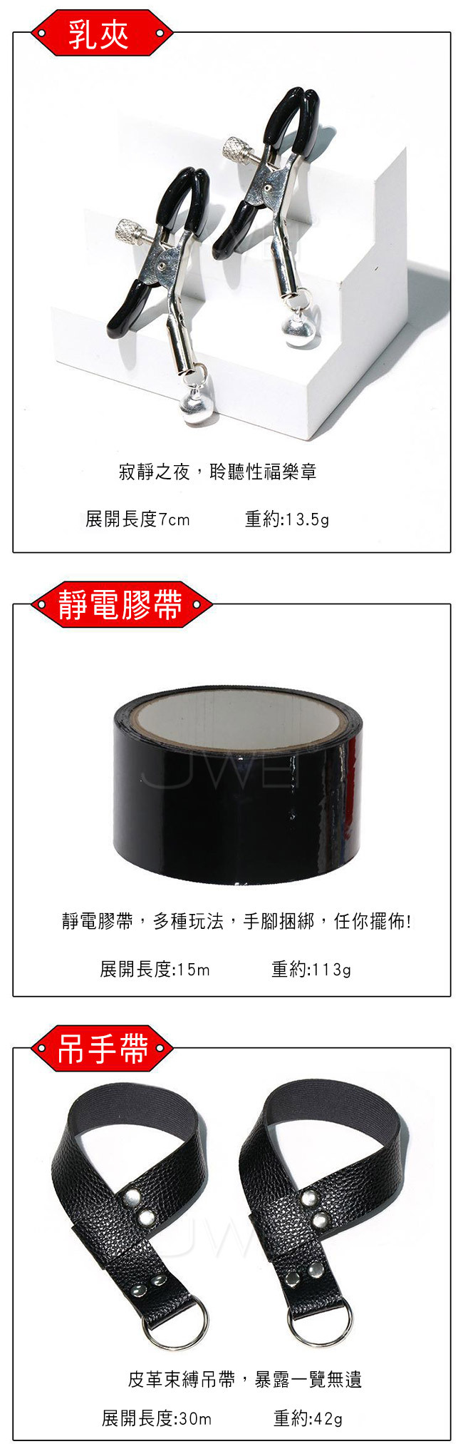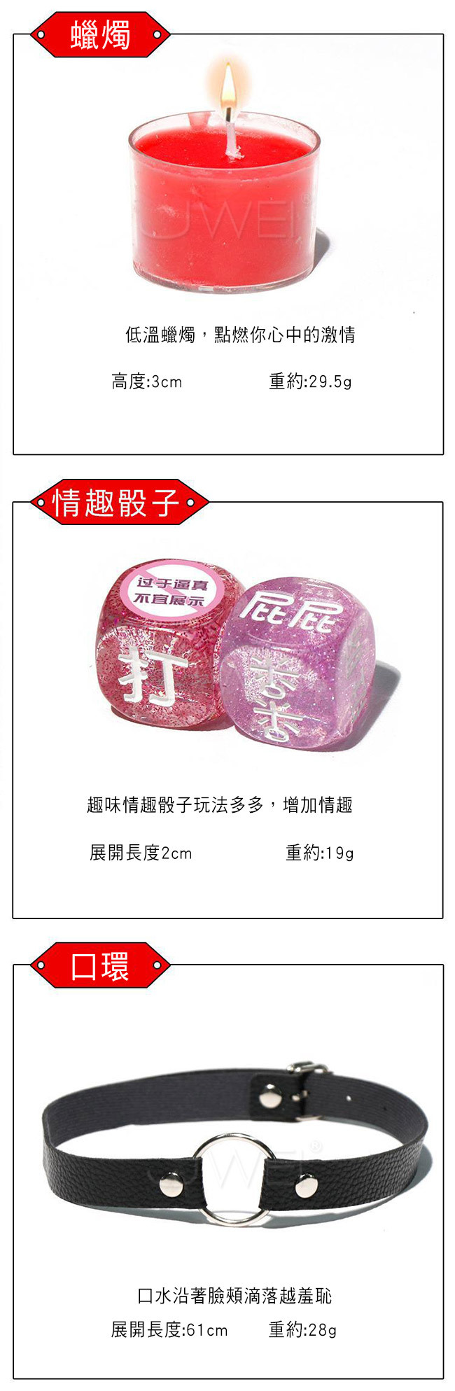 ■內容:眼罩、口球、項圈、牽引鏈、手銬、腳銬、羽毛棒、捆綁繩、十字扣、皮鞭、乳夾、膠帶、吊手帶、蠟燭、骰子、口環
