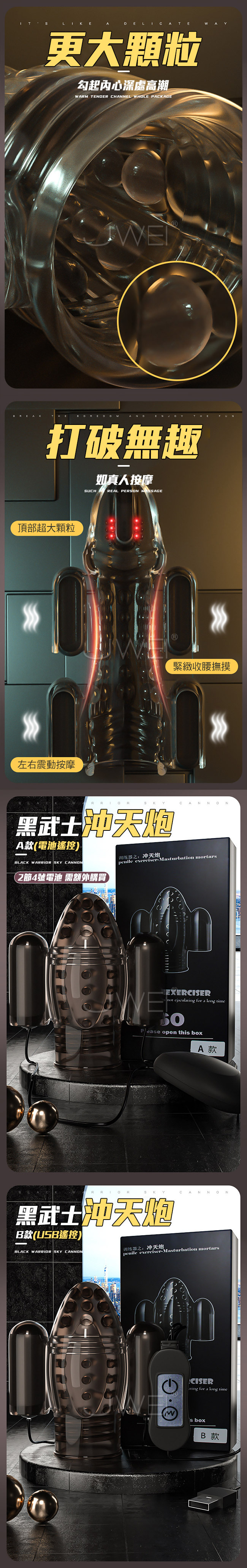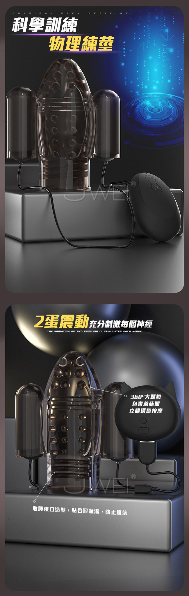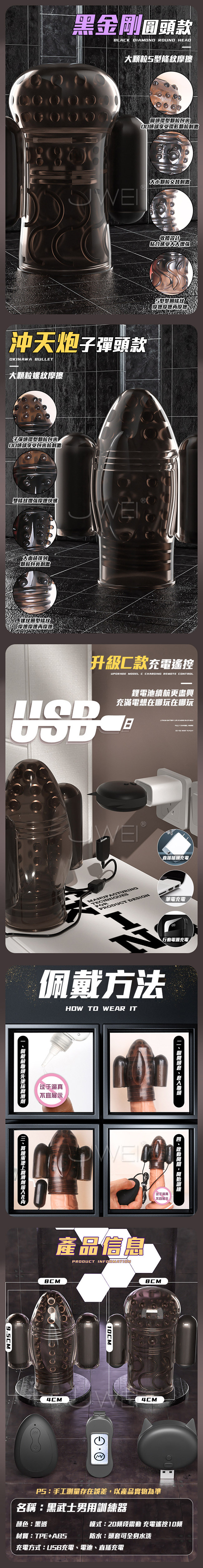 2蛋震動充分刺激每個神經,龜頭訓練360度多方位顆粒按摩。彪悍動力體驗多方位酥麻震動、舒緩、勺速、增速深淺波動交替震動。收腰束口造型,貼合冠狀溝,防止脫落,想要變強就用黑武士訓練器~邊訓練邊享受真男人的勇猛從此開始。