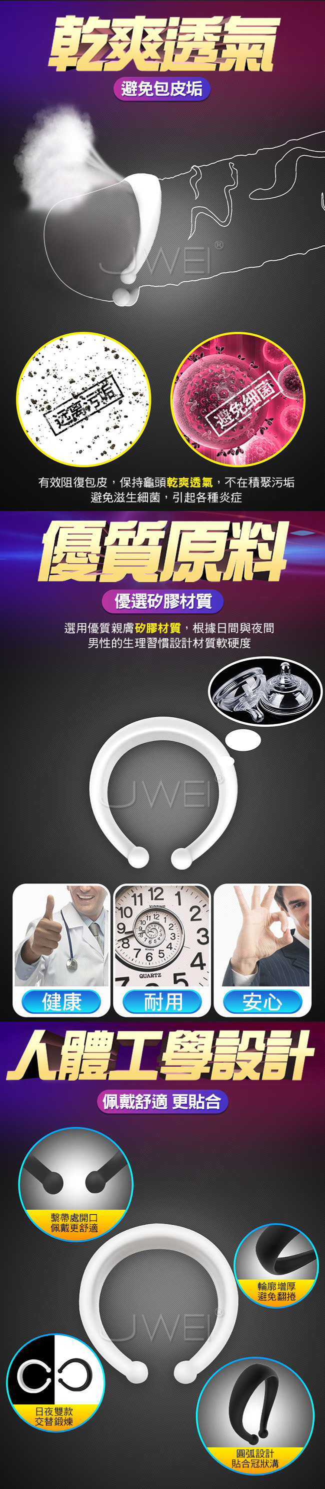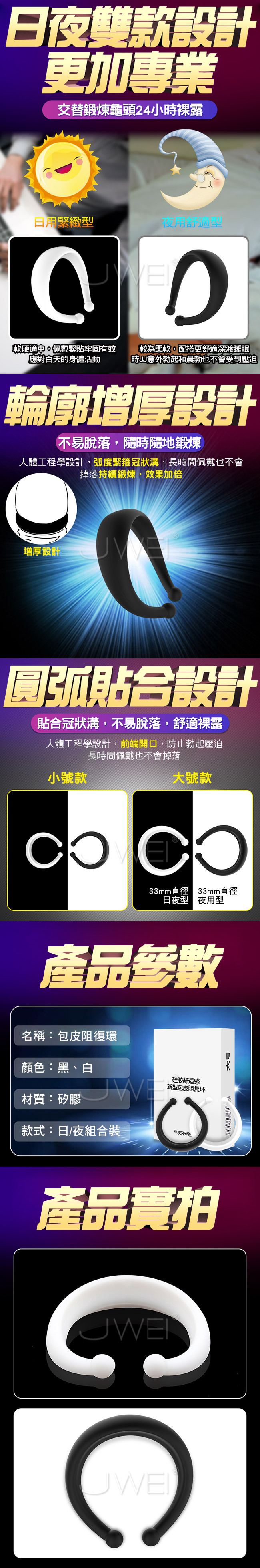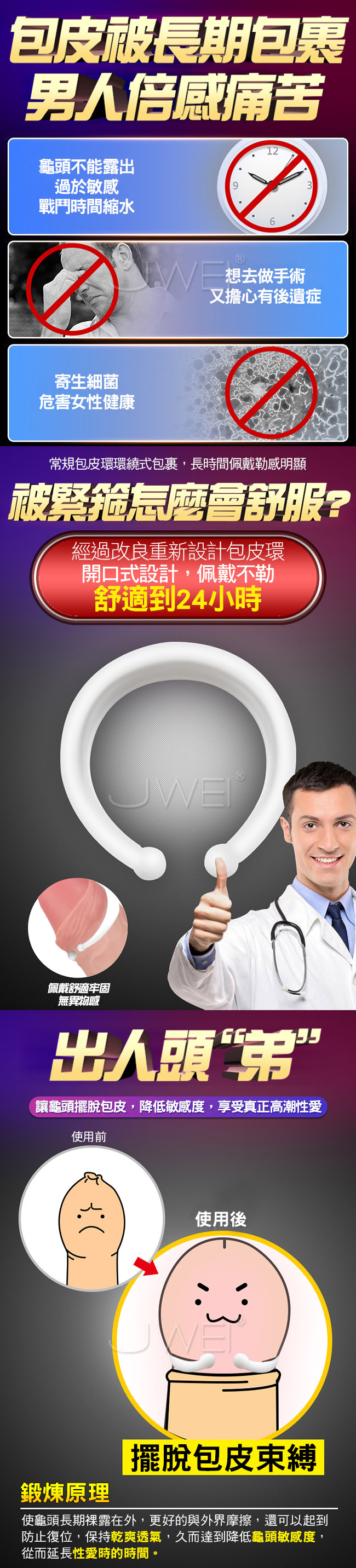有效阻隔裸露龜頭,降低敏感硬挺耐戰。經過改良重新設計包皮環,繫帶處開口式設計,配戴不勒,舒適到24小時。讓龜頭擺脫包皮,降低敏感度,享受真正高潮性愛。保持龜頭乾爽透氣,不再積聚汙垢,避免孳生細菌,引起各種炎症。選用優質親膚矽膠材質,根據日間與夜間男性的生理習慣設計材質軟硬度。日夜雙款設計更加專業,交替鍛鍊龜頭24小時裸露。