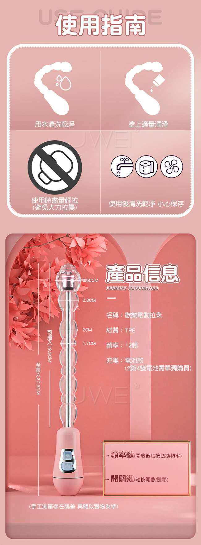歡樂電動拉珠解鎖百變玩法,自由彎曲不間斷調整蠕動刺激觸碰內在嗨點,整根龍骨想怎麼轉就怎麼轉。舒適彈滑軟膠Q彈舒適不拉傷。升級強勁動力,頂部嵌入強震馬達帶動整根棒身有力震 激,從而酥麻整個刺激點。