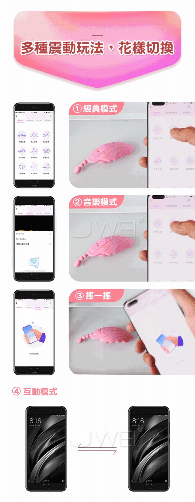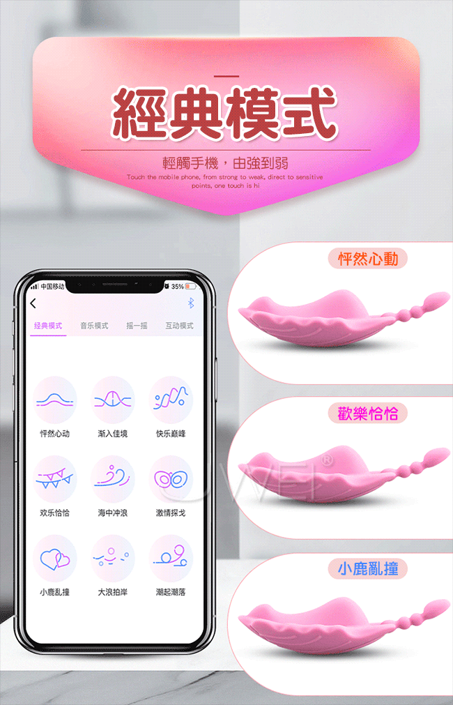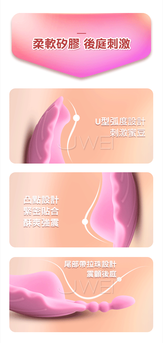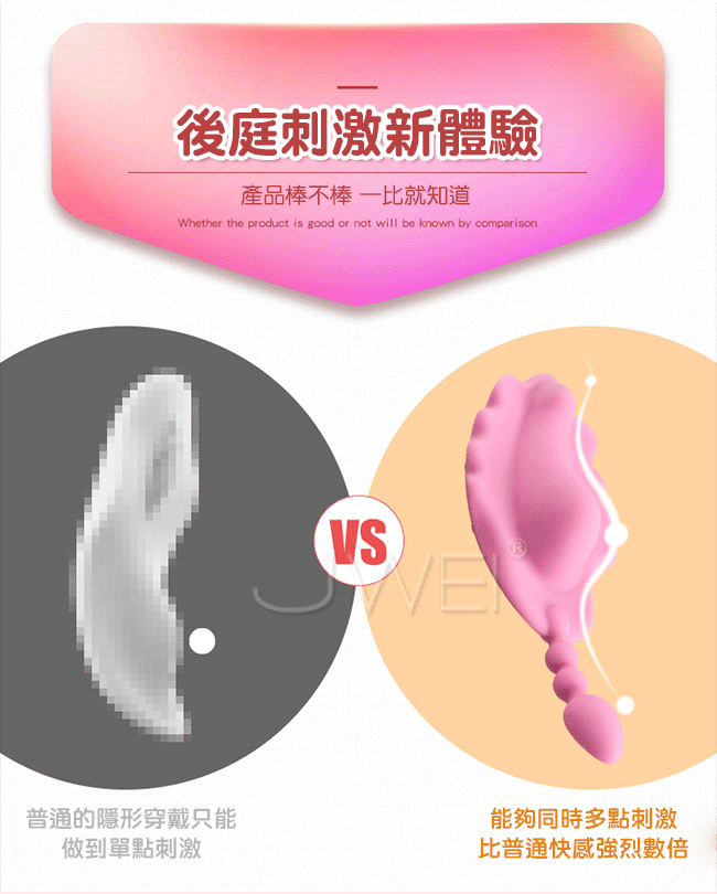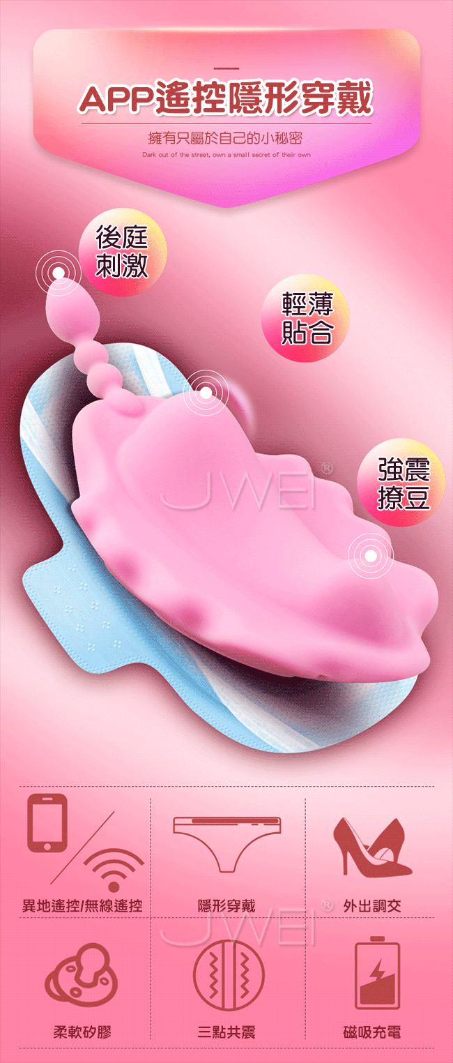 APP遙控隱形穿戴擁有只屬於自己的小秘密,多種震動玩法,花樣切換。小巧精緻輕薄如羽翼,護墊造型穿戴舒適。柔軟矽膠後庭刺激尾部帶拉珠設計震顫後庭,產品棒不棒一比就知道。外出穿戴不一樣的刺激體驗,就算旁邊有人也察覺不到。她的激情由你來掌控,舒適的就像沒有穿一樣~