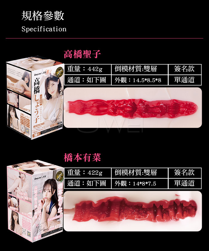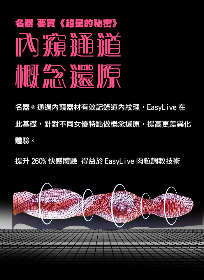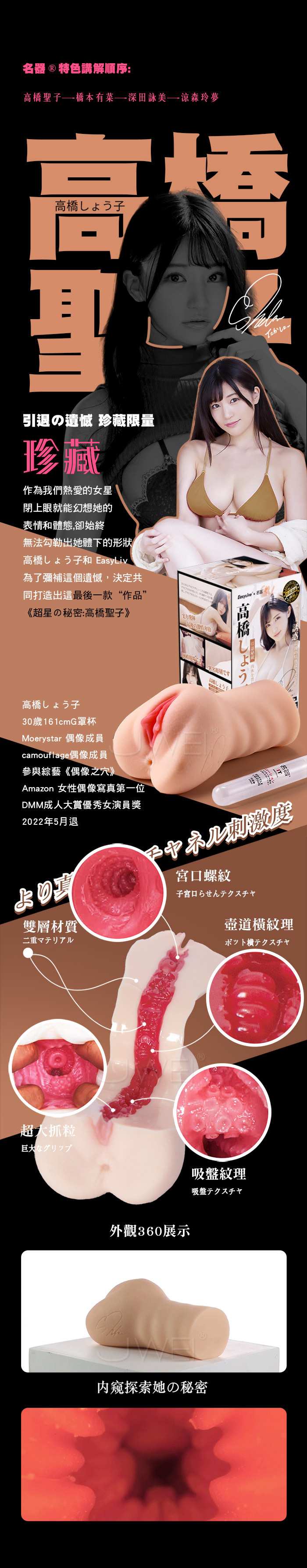 《超星の秘密:高橋聖子》引退の遺憾珍藏限量,作為我們熱愛的女星 閉上眼就能幻想她的表情和體態,卻始終無法勾勒出她體下的形狀,高 橋しょう子和 EasyLiv為了彌補這個遺憾,決定共同打造出這最後一款 作品,宮口螺紋、壺道橫紋理、超大抓粒、吸盤紋理,值得一試。