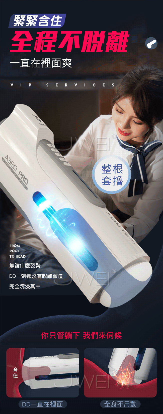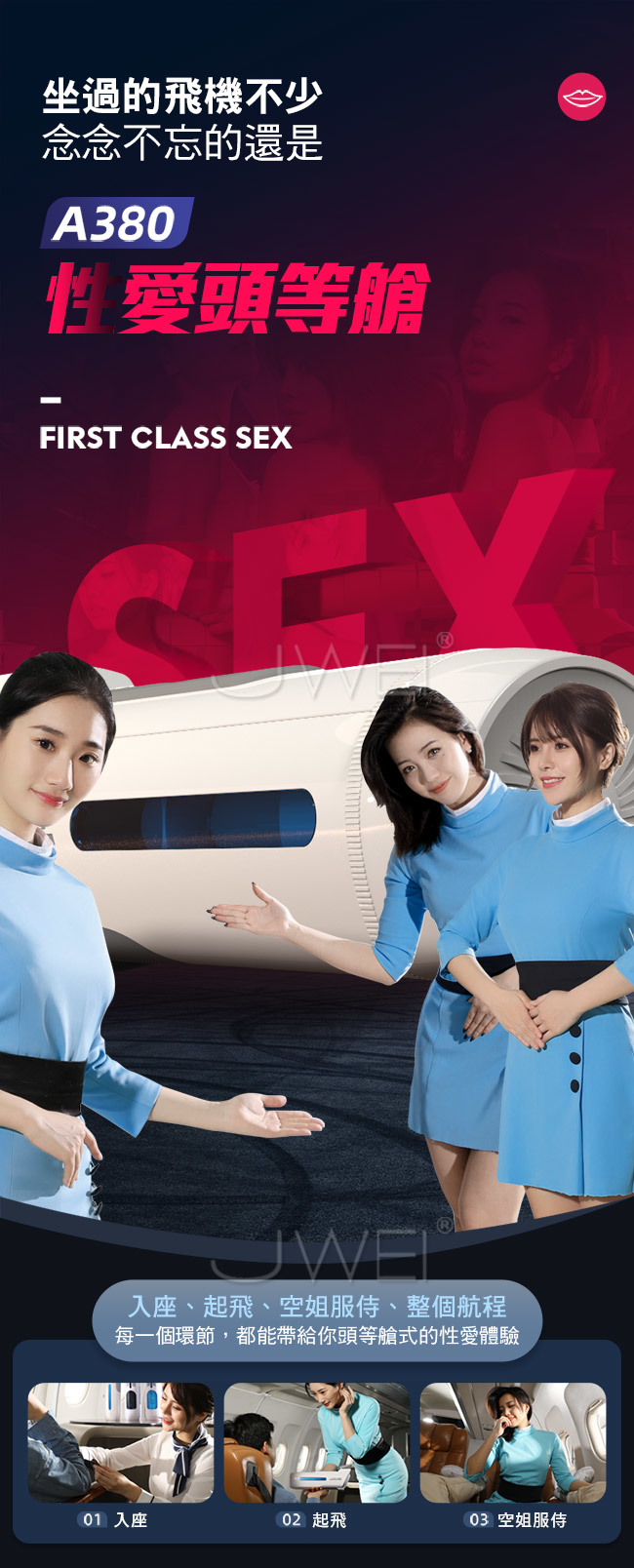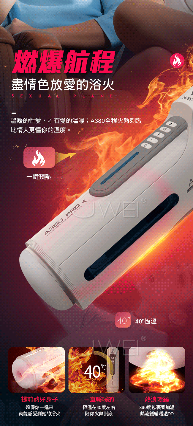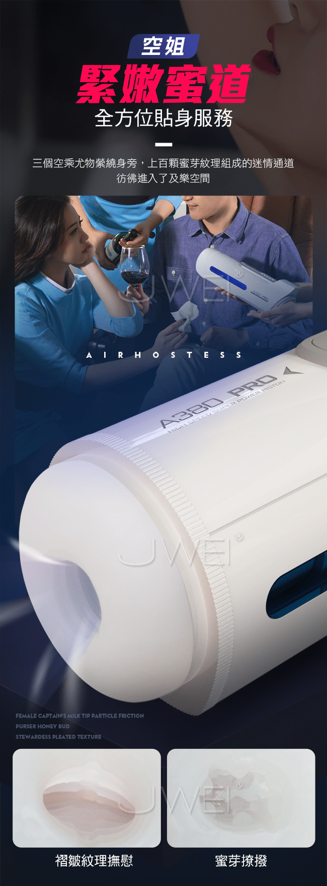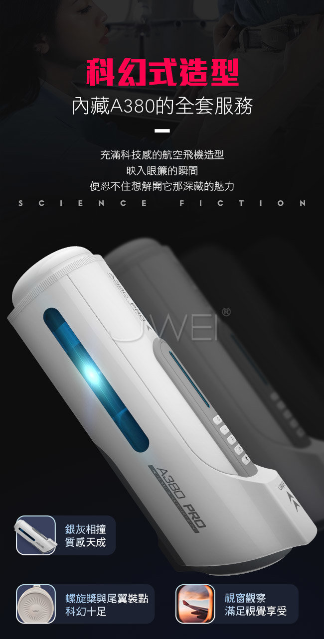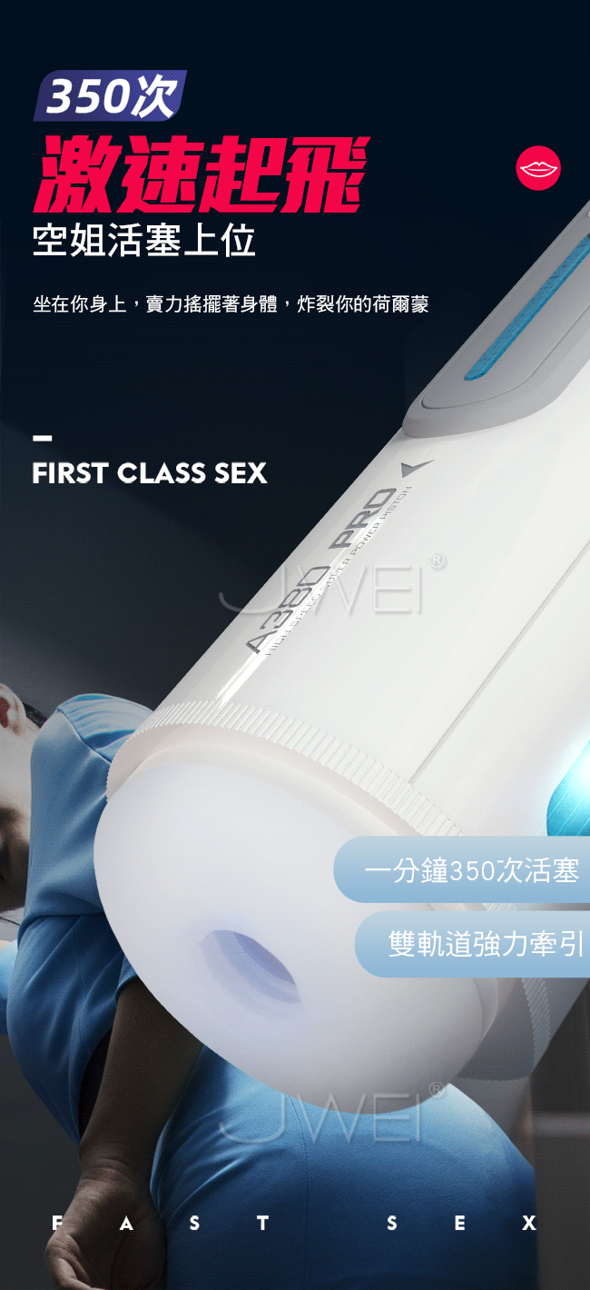 A380三代性愛頭等艙再升級全套豪華配備,一分鐘350次活塞上位,讓您享受空姐坐在您身上賣力搖擺的快感。緊嫩蜜道由上百顆蜜芽紋理組成的迷情通道緊緊吸附著您,彷彿進了極樂空間。擁有智能發聲功能,給您親臨現場的快感體驗來自雲尖上的誘惑。並且A380三代採一鍵預熱讓您全程享受被暖暖的包裹住猶如情人般真實。