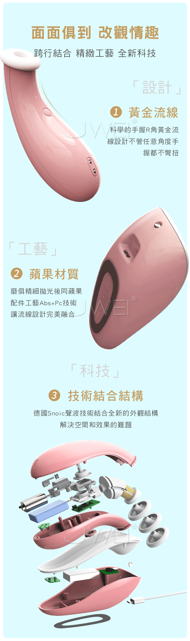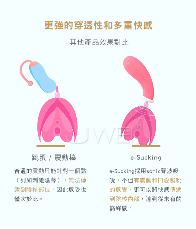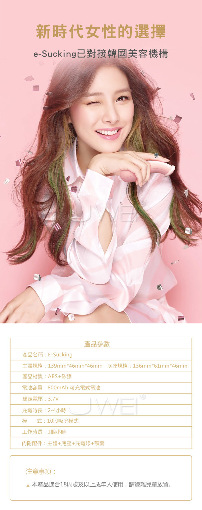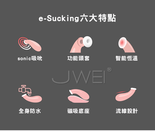e-Sucking採用快頻率的聲波吐吸的全新科技,即使再冰冷的你60秒讓你暗流湧動。e-Sucking不但有震動和口愛吸吮的感覺,更可以將快感傳遞到陰核內部,達到從未有的巔峰感。智能口感恆溫38度C快速達到真實口腔溫度,適宜冬天使用。搭配磁吸充電底座,不用再擔心敏感的外觀而躲躲藏藏讓整體充滿高端和不俗。