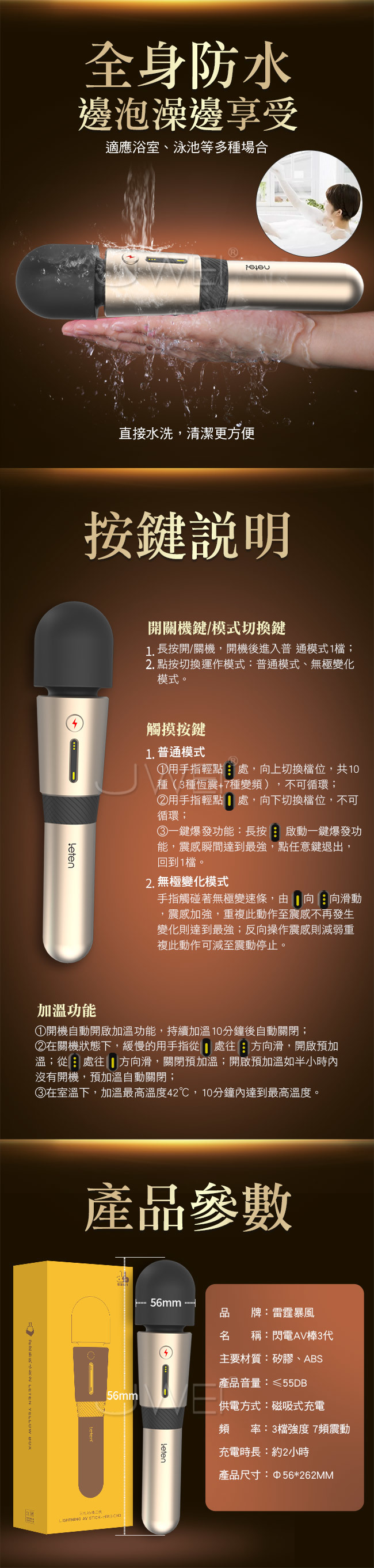閃電3代全新改升級採用親膚矽膠包裹,讓接觸面更舒服,提升舒適感,從而獲得更大滿足。握住手柄拇指按動開關或者觸控操作都非常便捷使用上更順手喔~超強震動力的棒頭帶給你閃電般的快感,真的很暴風般的高潮。開機棒頭自動加熱,全程火辣辣的震,讓慾望之火熊熊燃燒從全身遊走到猛攻陰蒂,閃電般快感傳遍全身。