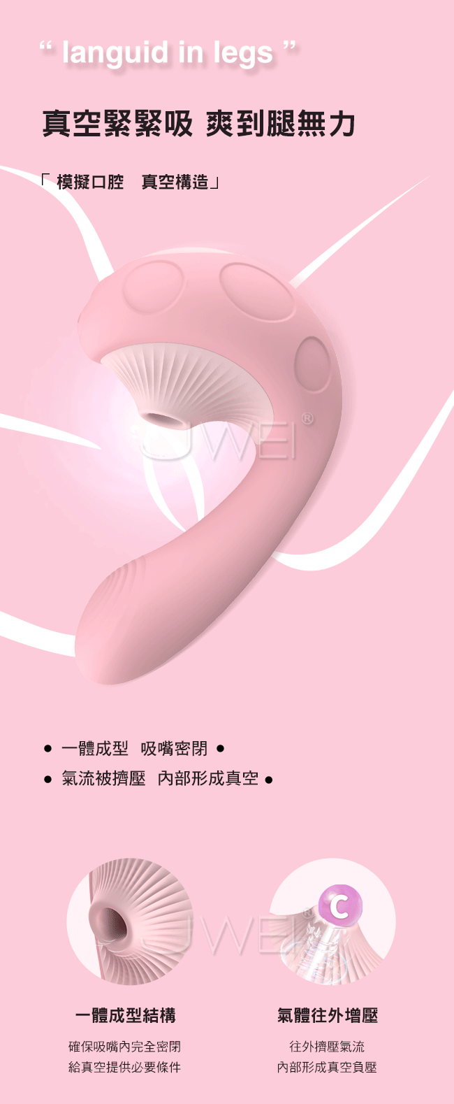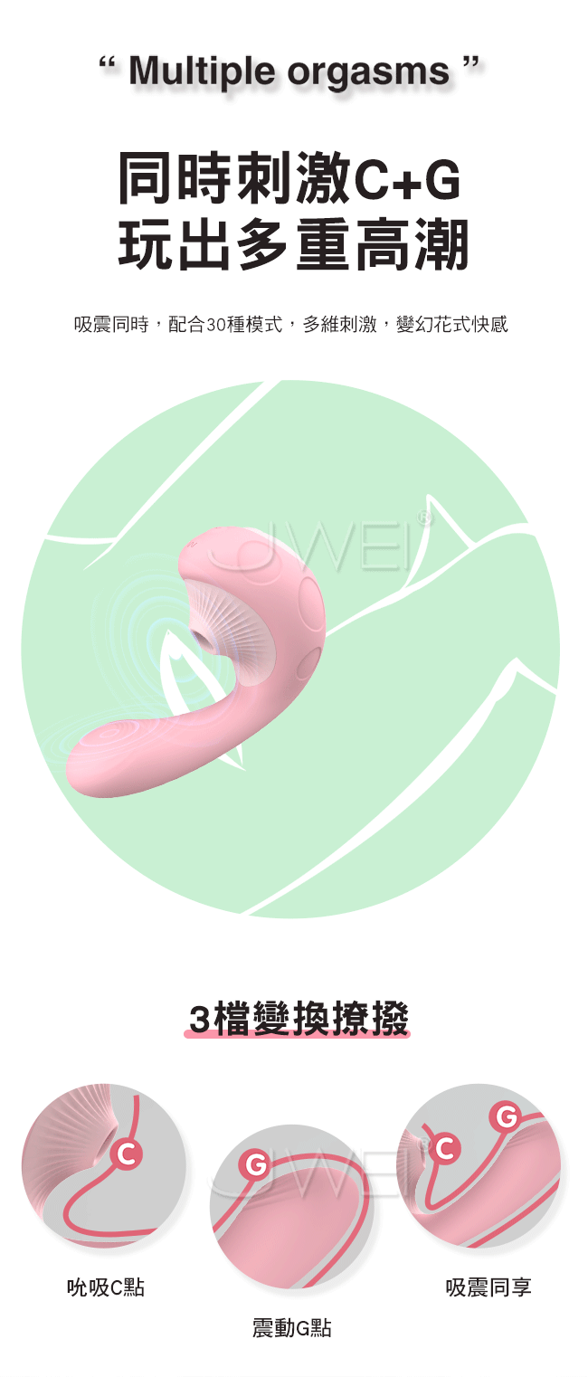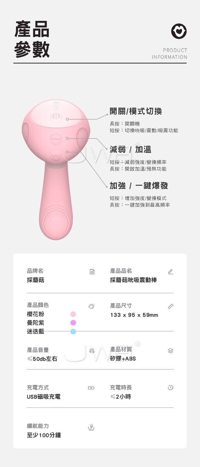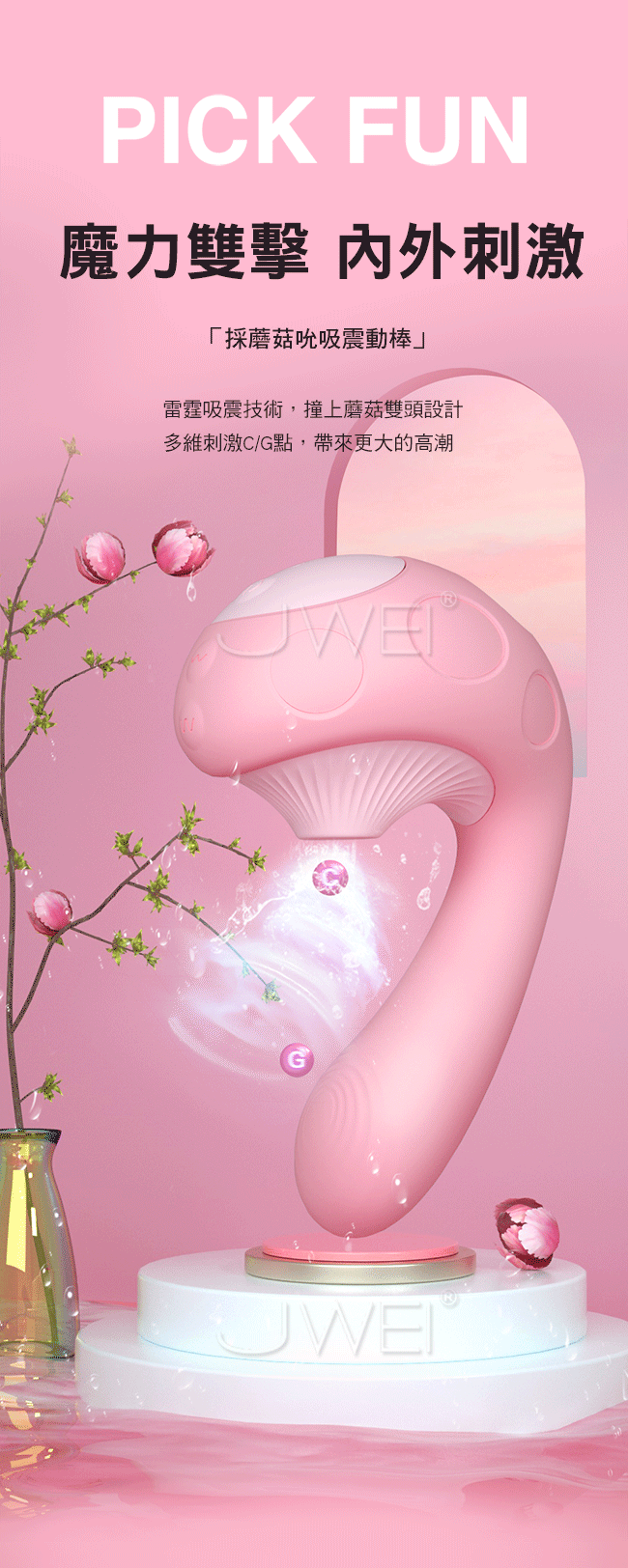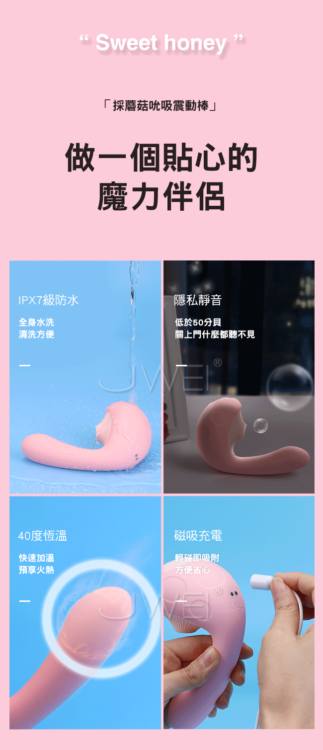 採蘑菇吮吸震動棒,撞上蘑菇雙頭設計多維刺激C/G點,帶來更大的高潮。魔力雙擊蜜豆G點同時爽,強吸+深震,帶來內外全面高潮。模擬口腔真空緊緊吸,爽到腿無力。吸震同時配合30種模式,多維刺激變幻花式快感。