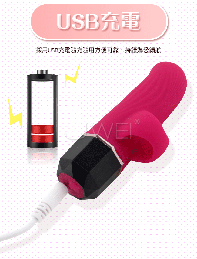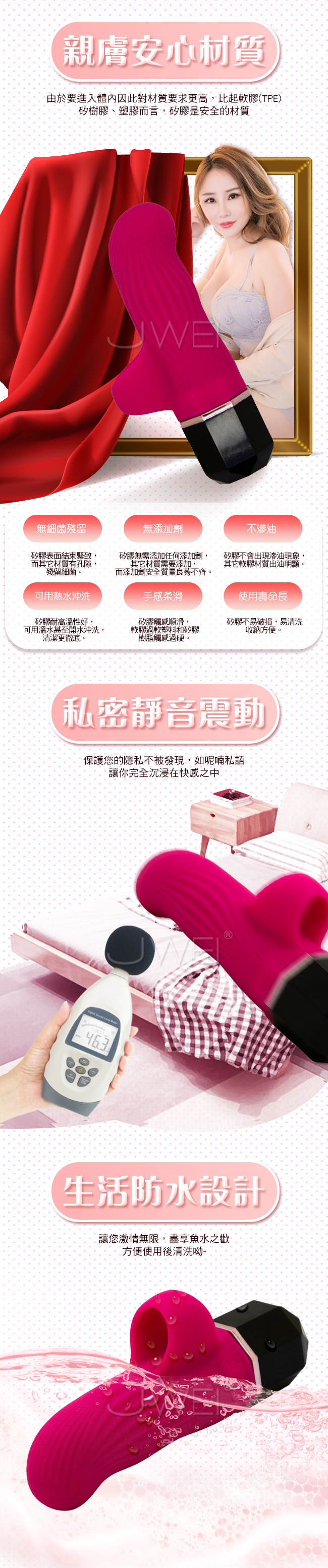 此款由於要進入體內因此對材質要求更高,比起矽樹膠、塑膠而言,矽膠是安全的材質,讓您更安心使用。且靜謐防水設計,保護您的隱私不被發現,如呢喃私語讓你完全沉浸在快感之中,不受場地所束縛。波紋棒身可刺激蜜穴G點,搭配12段變頻震動攪亂您花心直達高潮~棒身指套設計可讓手指插入增加摳動感喔~