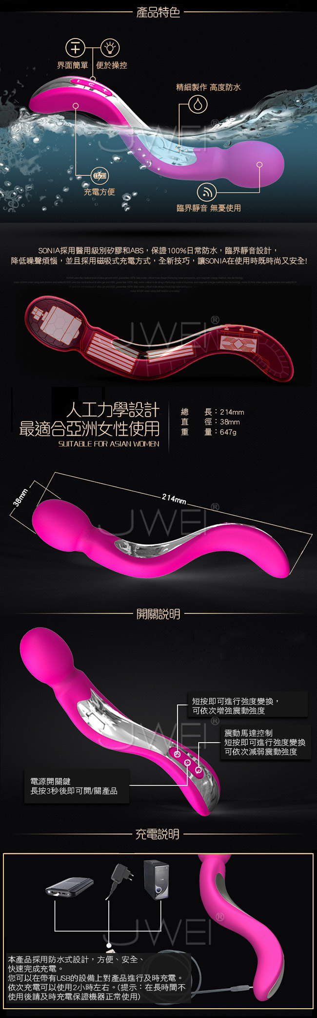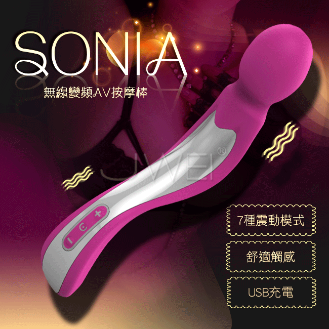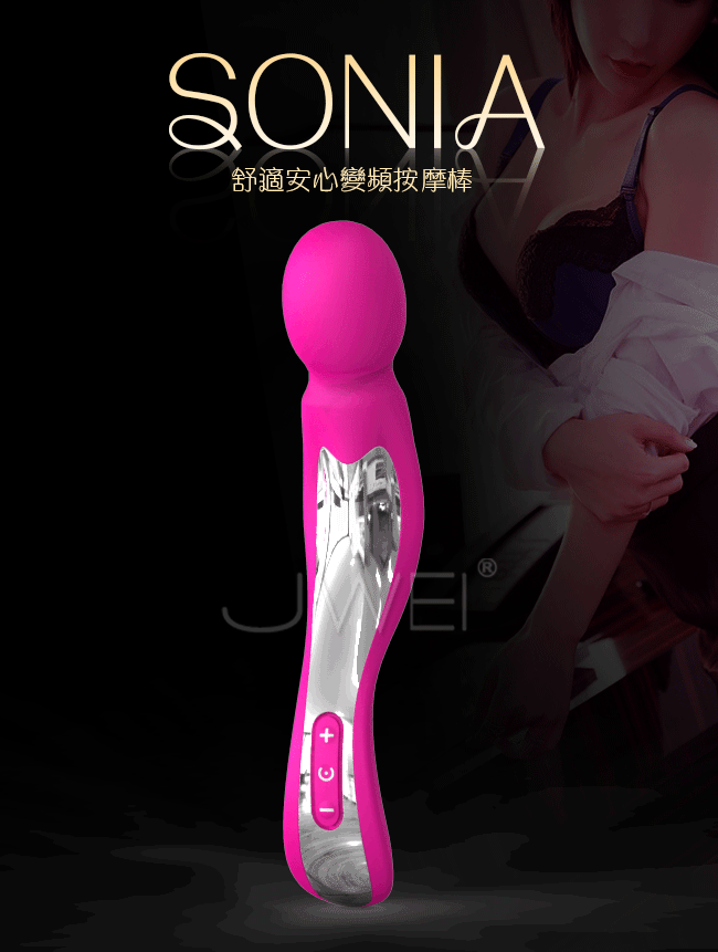 SONIA秉持一貫歐洲奢華性感風範,按摩器震動強度親密接觸身體,讓您的全身範圍均可按摩及刺激, 並且不會傷害您嬌嫩的肌膚,給使用者用好的性福享受。SONIA擁有讓人一見傾心的S型身材,奢華性感的色彩,溫潤爽滑的觸感,必將成為眾多女性鐘愛的一款AV按摩棒!