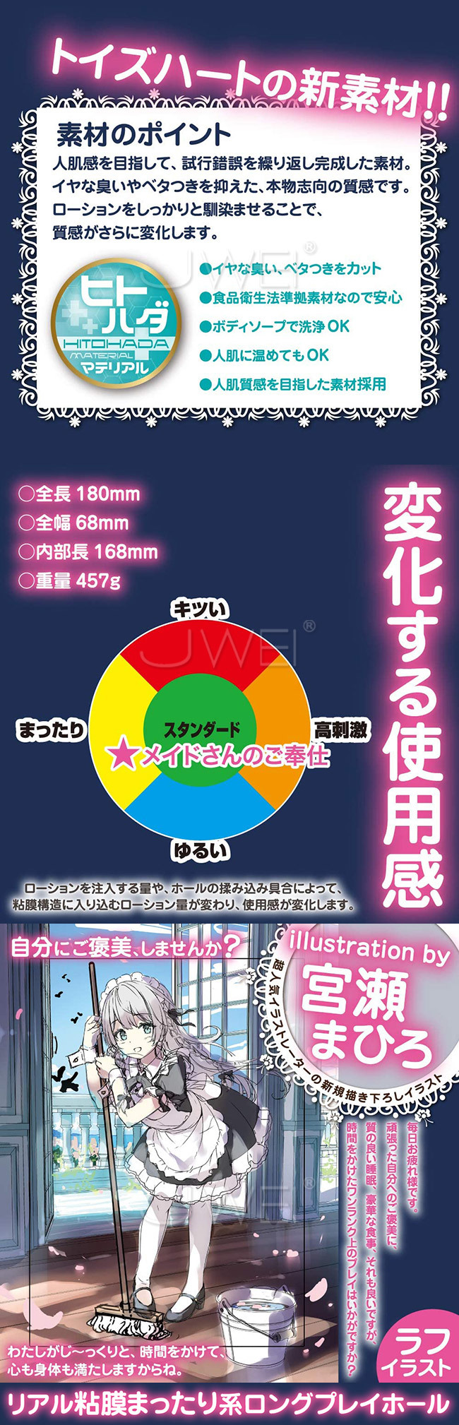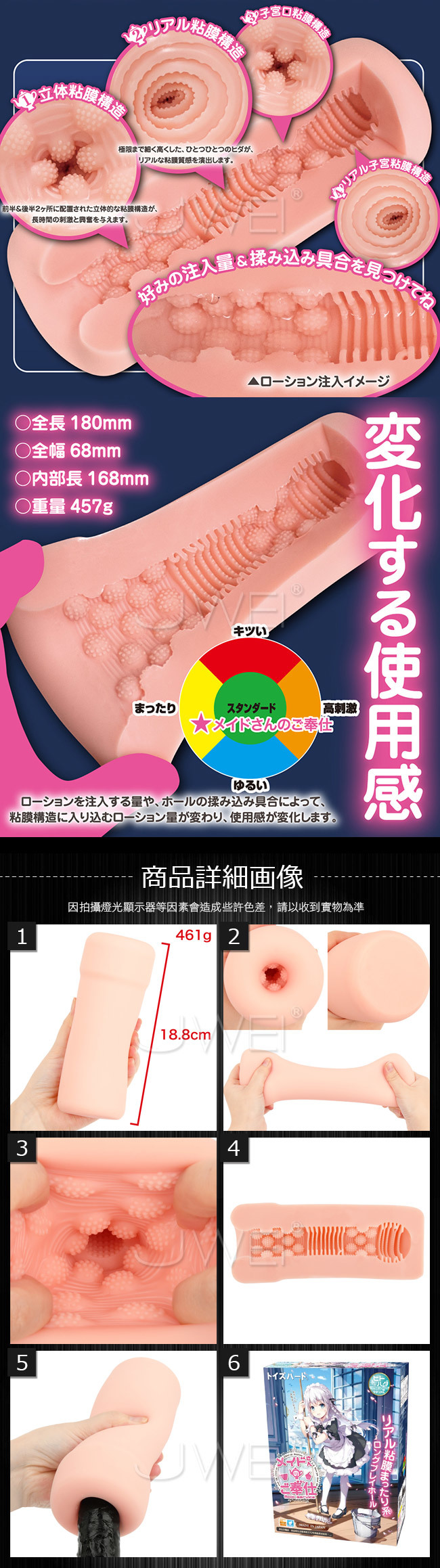 毎日おつかれさまです。 頑張った自分へのご褒美に、時間をかけたワンランク上のプレイはいかがですか? 前半と後半に2箇所配置された立体的な粘膜構造が、長時間の刺激と興奮を与えます。さらに進むと、ひとつひとつのヒダが、リアルな粘膜感を演出。さらに進めば、子宮口粘膜構造があなたを受け止めます。 人肌感を目指して、試行錯誤を繰り返し完成した素材。 イヤな臭いやベタつきを抑えた、本物志向の質感です。