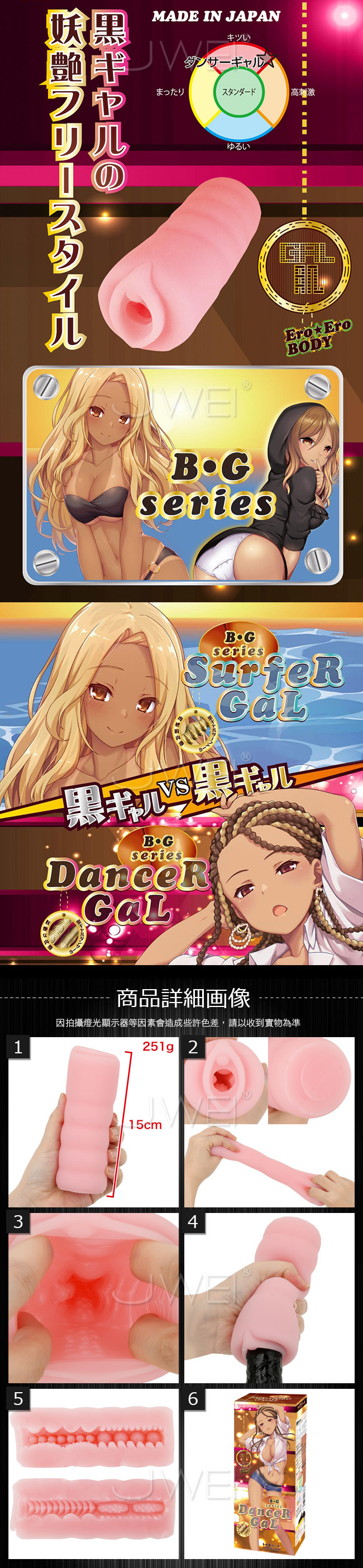 ダンスを愛する黒ギャルの妖艶フリースタイルオナホ。 大ぶりなヒダ、巨大な楕円&無数のイボ、細かなイボ、巨大イボの4つの刺激が中央で90度回転する究極のコンビネーションホール。 様々なメディアやイベントに引っ張りだこの超売れっ娘をイメージしたオナホ。 ダンスで腰を振り続けてきた腹筋や肉体美は必見! グラインド&トルネード騎乗はイクまで止まらないというエロチックさ。 全体のフォルムは筒型で、弾力のあるエラストマーの自然な締め付けもありで、内部の4つのギミックもしっかり感じられる素材感。