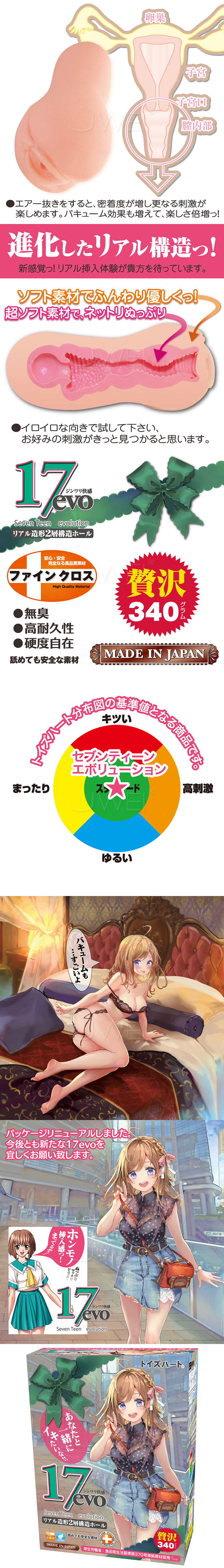 大人気オナホール「17 セブンティーン」の新ヴァージョン「17 セブンティーン エボリューション」が登場。内部の超ソフト素材と外部のソフト素材が織り成す驚愕のリアル2層構造「17 セブンティーン」の遺伝子はそのまま!!その快感に加えて、ボリュームアップした肉厚340gと、より安全かつ本物素材へ拘った究極の商品。子宮内部を忠実に再現したホール内部は、とにかく「リアル」を追求した、一切の妥協を許さない至高ホール。本物に限りなく近い快感と挿入感は、貴方の息子にジャストフィット!!