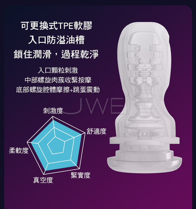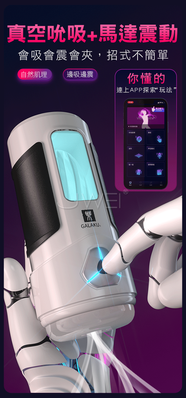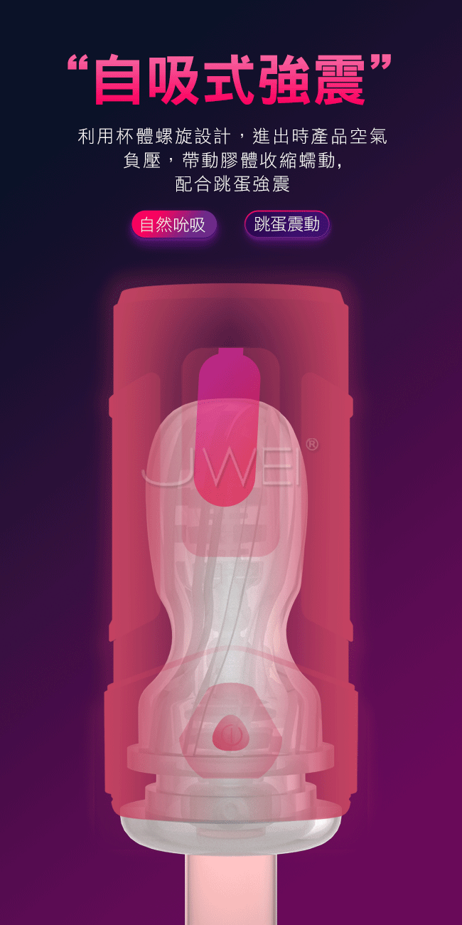 逆轉未來夢境般真實的觸感體驗,採用無線APP控制多樣玩法等您來體驗。真空吸吮+馬達震動會吸會震會夾,自然肌理招式不簡單探索更多刺激。利用杯體螺旋設計,進出時產品空氣負壓,帶動膠體收縮蠕動,配合跳蛋強震讓您越玩越嗨唷~