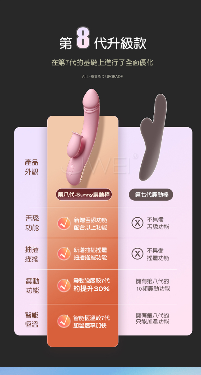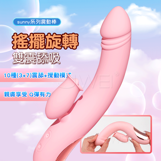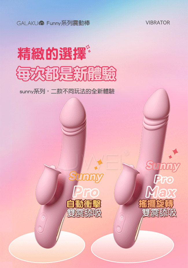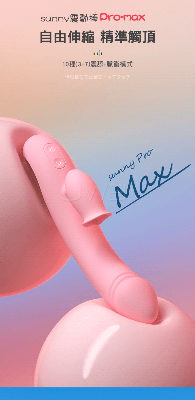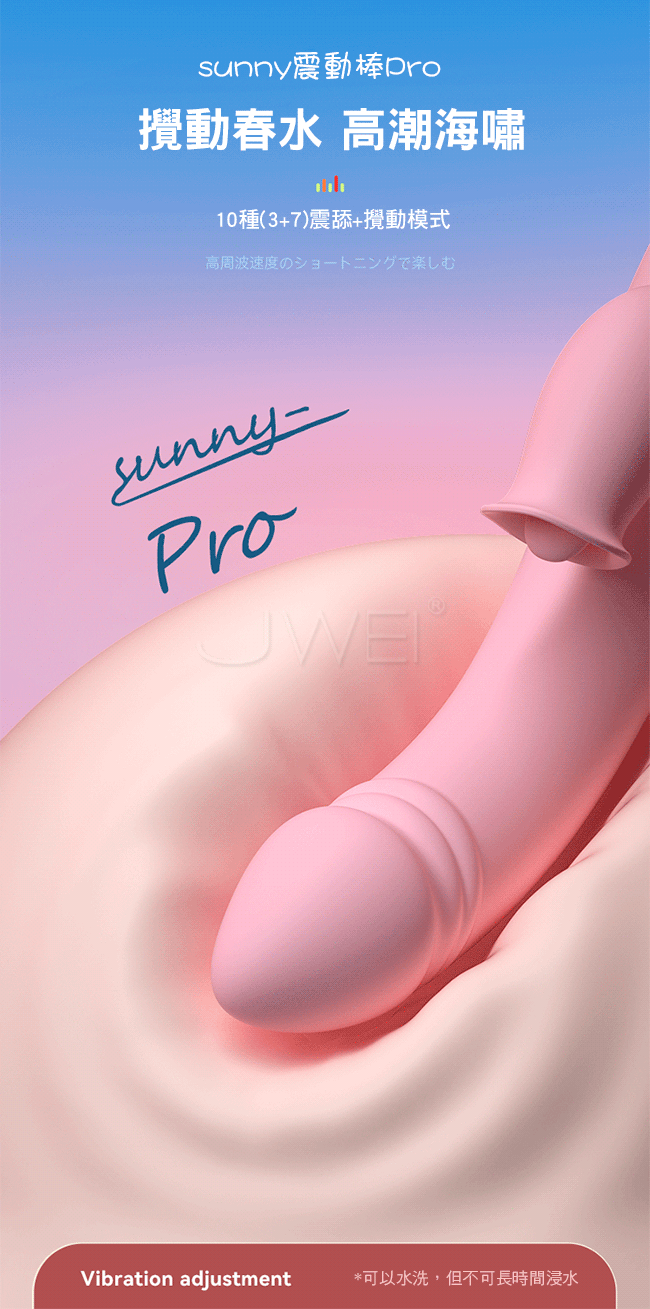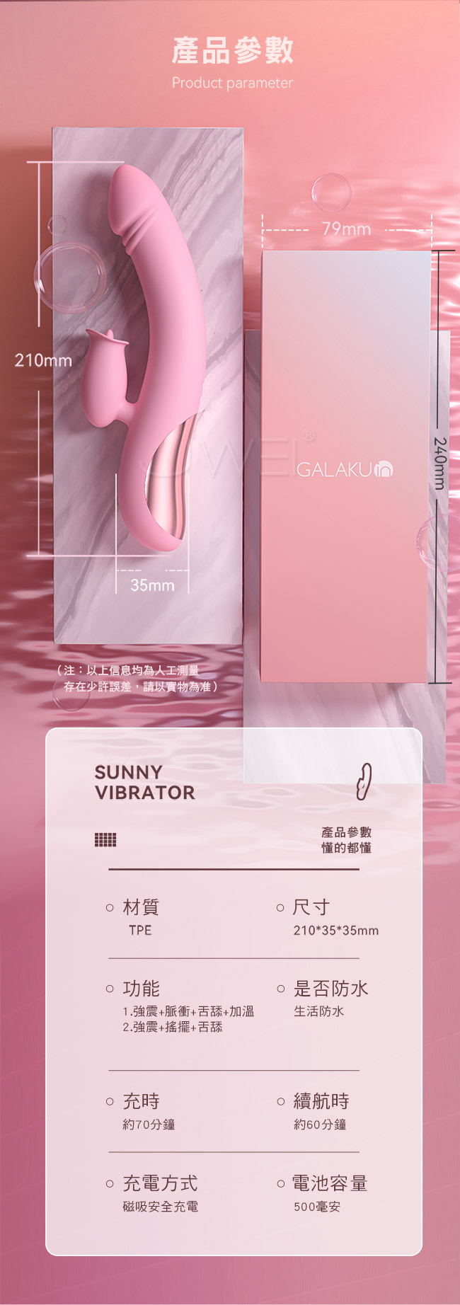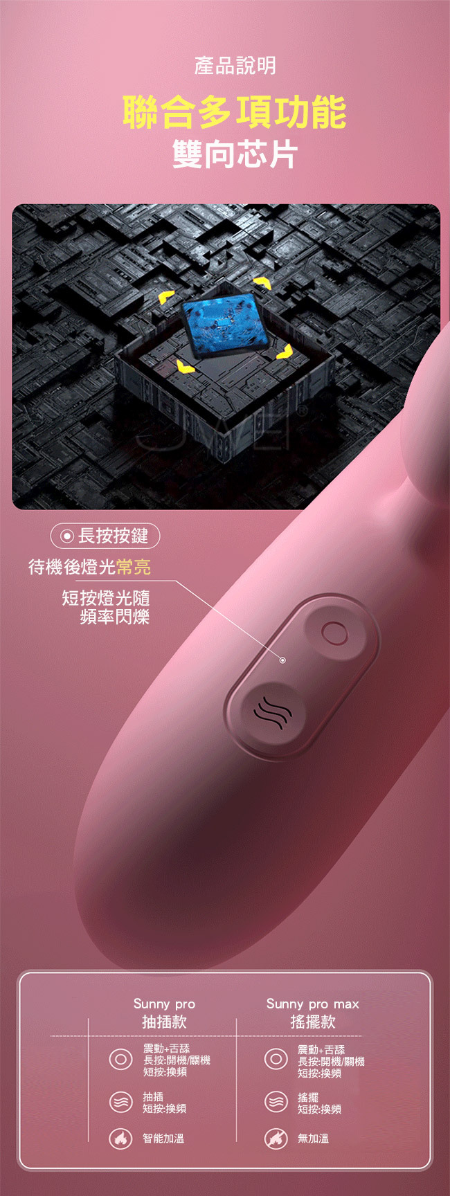 sunny系列,二款不同玩法的全新體驗,10種(3+7)震舔+攪動模式,攪動春水、高潮海嘯;靈舌舔吸,寬度剛夠,長度剛好,收腰設計,飽滿不撐大,尖頭易入不痛,符合人體工學設計;持久攪動,續航高潮體驗;31mm小瘦腰,柔軟輕便,入體無負重感,動起來無比舒爽;全身防水設計,使用後方便快捷清洗,不可以長時間浸水。