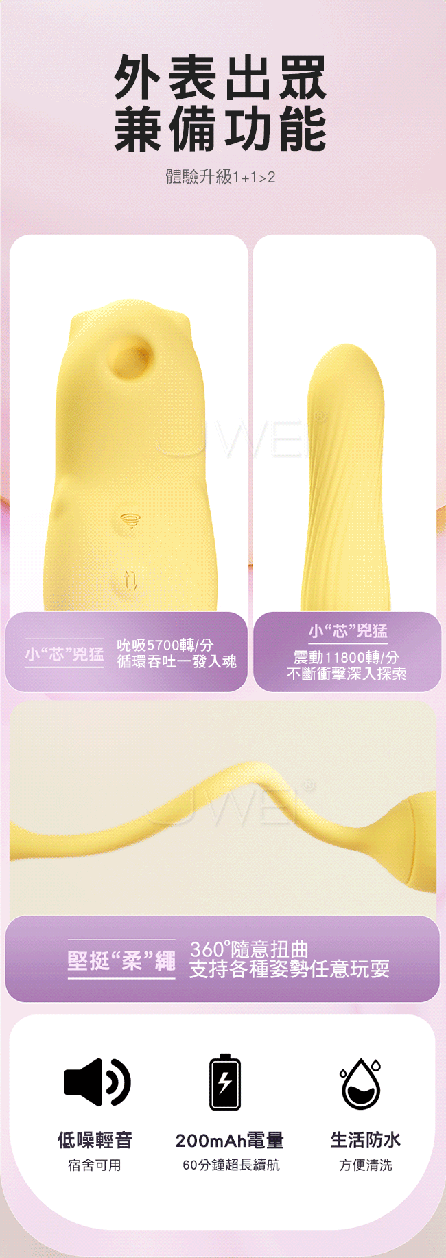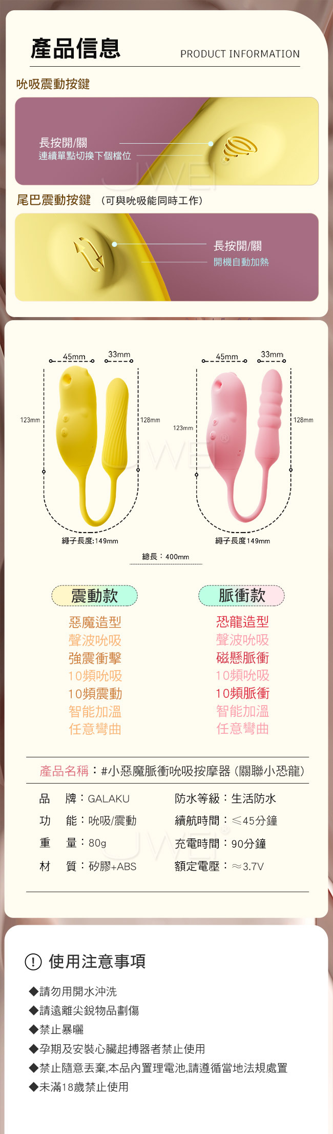 小惡魔造型,強勁雙輸出喚醒快感神經,真.雙重快感,擊穿G點,G點精準度+1,衝擊震動強度+2,吮吸5700轉/分,循環吞吐一發入魂;震動11800轉/分,不斷衝擊深入探索;讓肌膚和小惡魔一起互動,高頻吮吸互動、高頻強震進入;智能恆溫,自動還原真實體溫,暖心的愛,暖男體驗!!