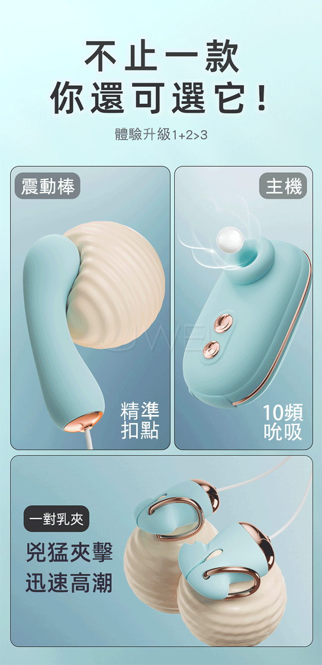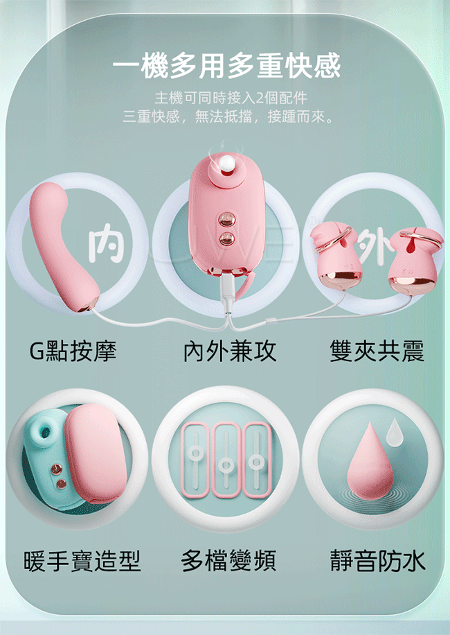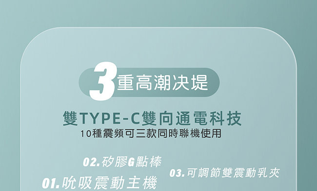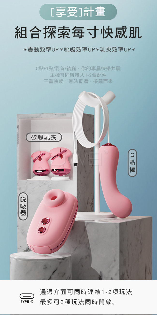 快感啟動大師夢幻組合,一機多用多重快感,主機可同時接入2個配件,快感無法抵擋,接踵而來;組合探索每寸快感肌,震動效率UP、吮吸效率UP;C點/G點/後庭,你的專屬快樂共震;按摩棒,G點按摩,精準扣點、吮吸主機內外兼攻;雙TYPE-C雙向通電科技,10種震頻可同時聯機使用,重要的柔軟親膚,可不僅僅低噪強震,整體採用用軟糯細膩的SIC矽膠材質,更健康安全的環保結構設計,適應多種膚質,使用更安全!