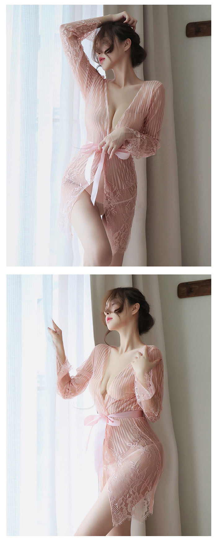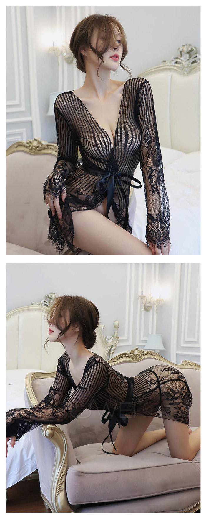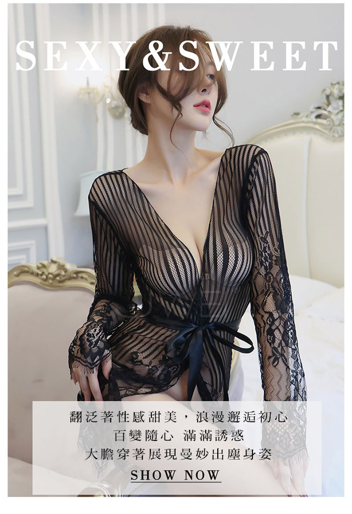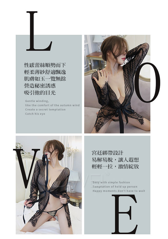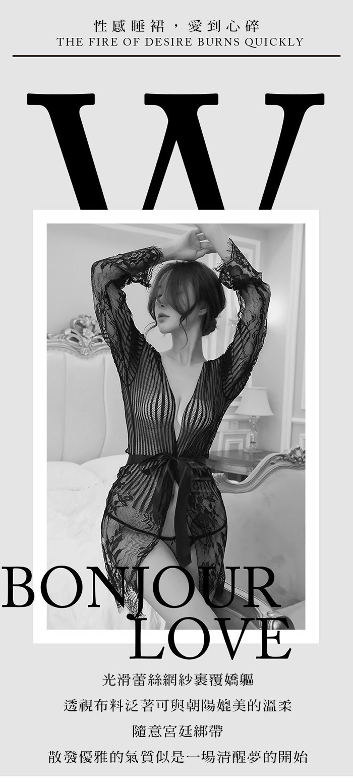 ◇◆情夜悸動.光滑蕾絲網紗性感透膚宮廷綁帶睡袍(黑色)◆◇