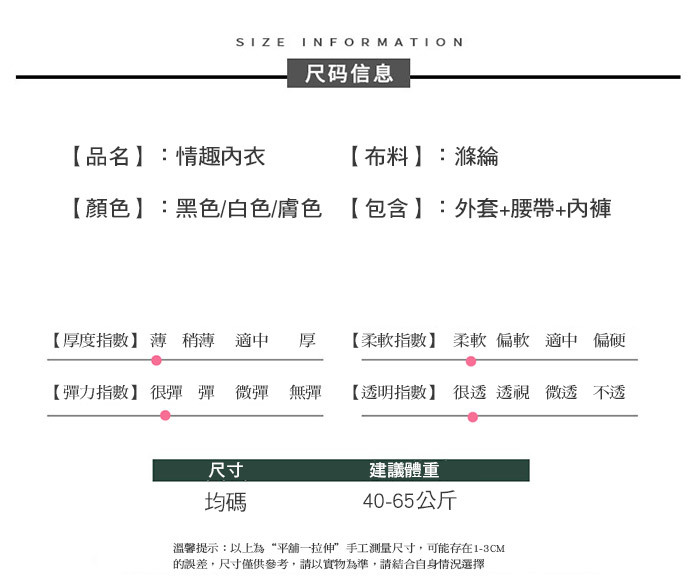 ■內容物:睡袍x1、腰帶x1、內褲x1