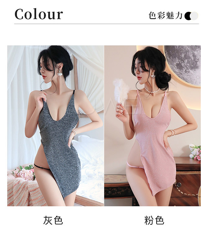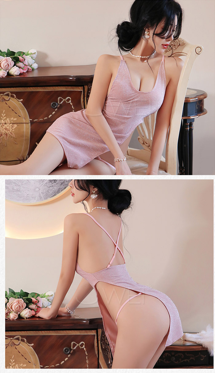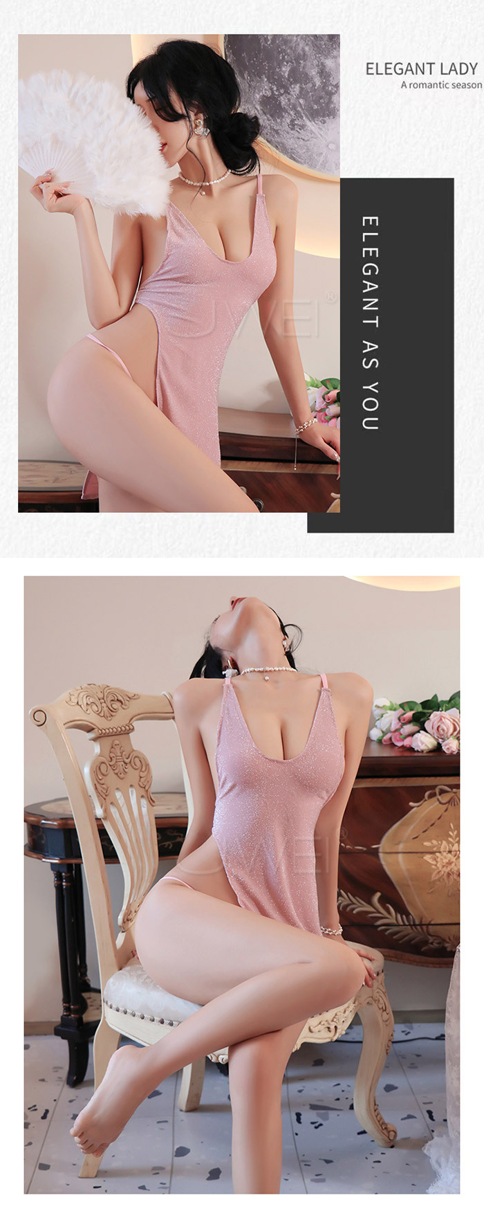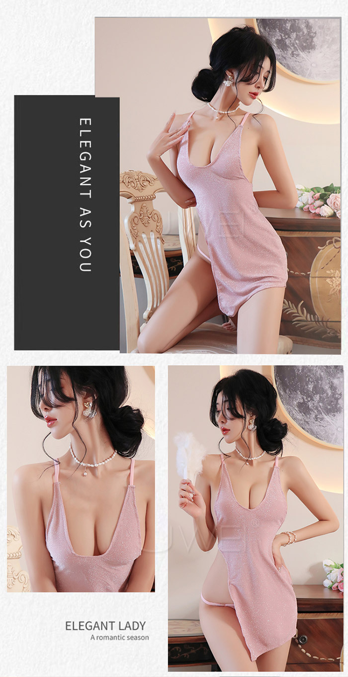 ◇◆暗香浮動.純慾深U露胸側腰開叉吊帶連身睡裙(粉色)◆◇