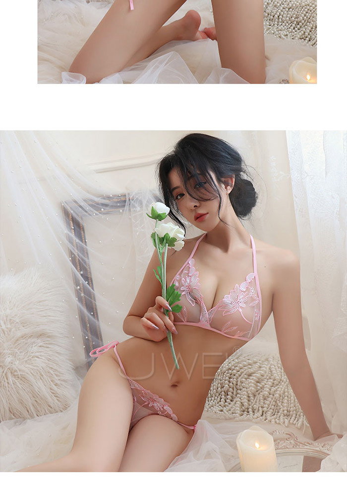 柔情佳人.火辣繫帶三點式蕾絲透視套裝-粉色