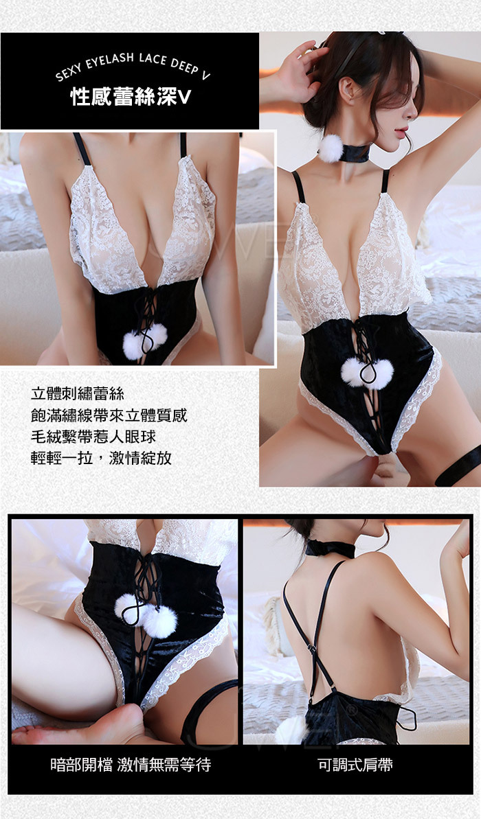 甜漾狂想.性感刺繡蕾絲深V露溝暗部開檔兔女郎套裝4件組