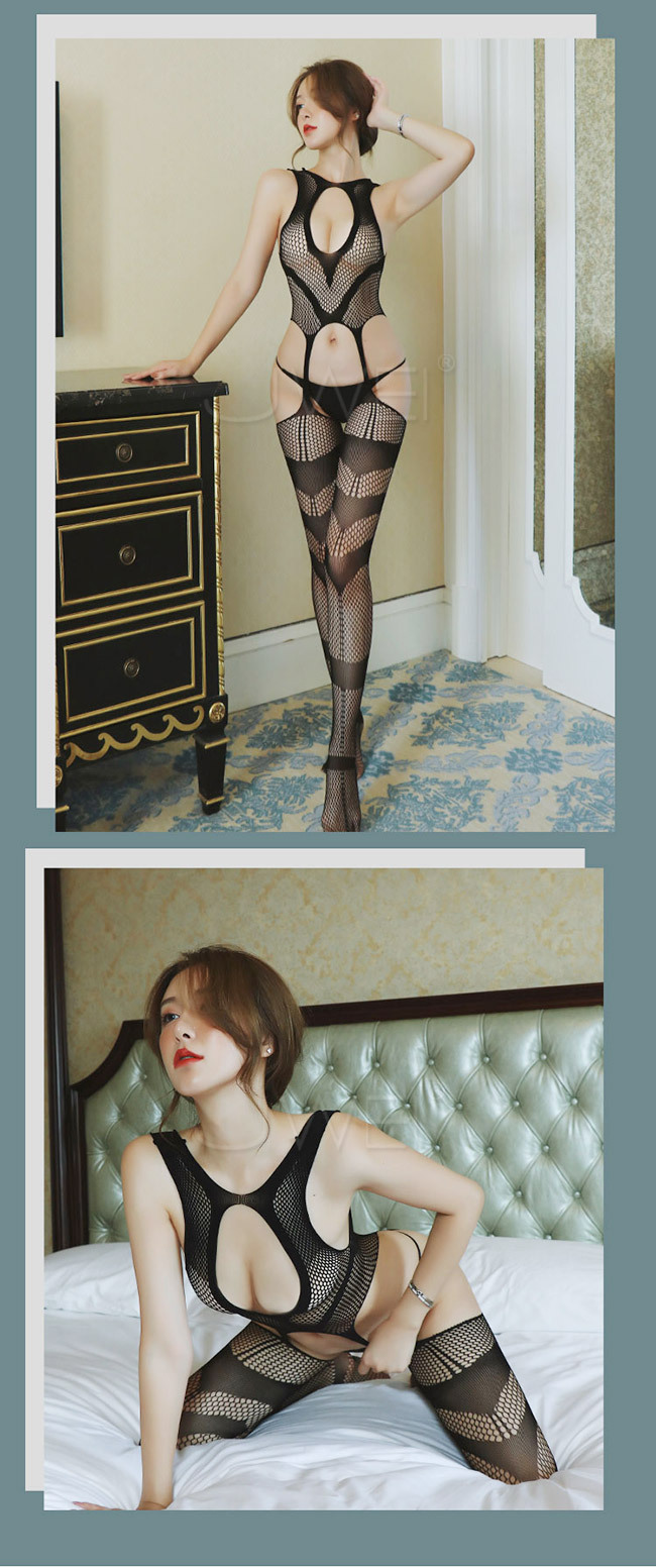 靜待愛戀.性感胸前圓孔透視鏤空美背吊襪連身貓裝