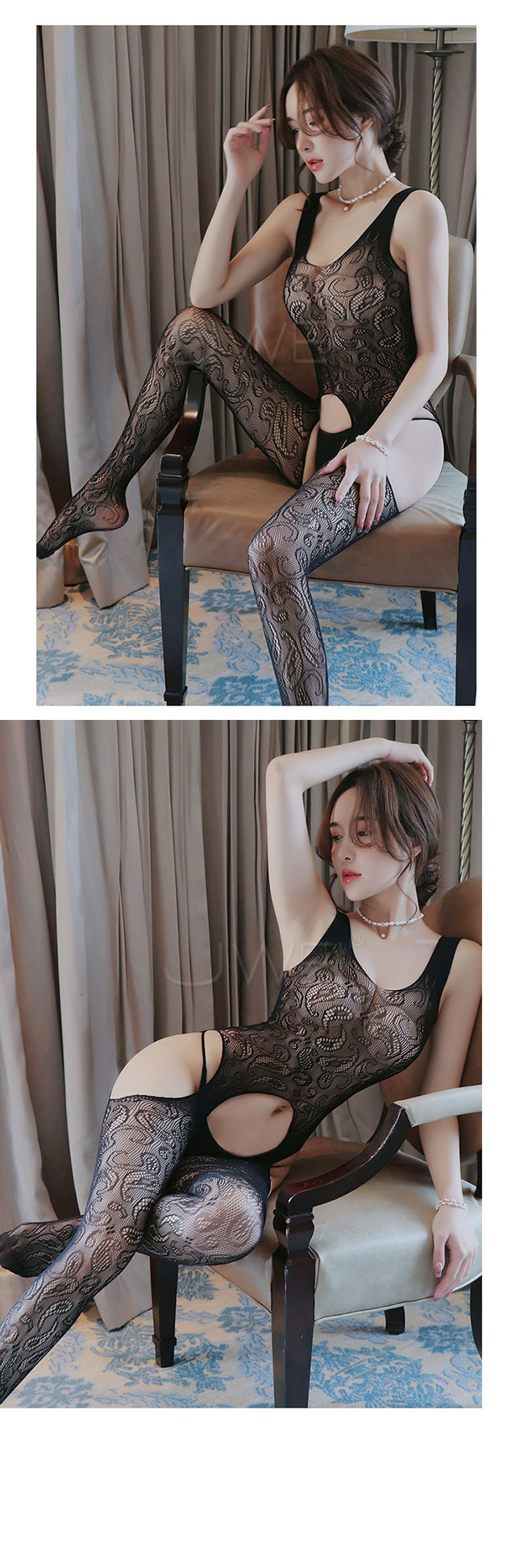 靜待愛戀.魅力修身鏤空提花透視一體吊襪誘惑連身貓裝