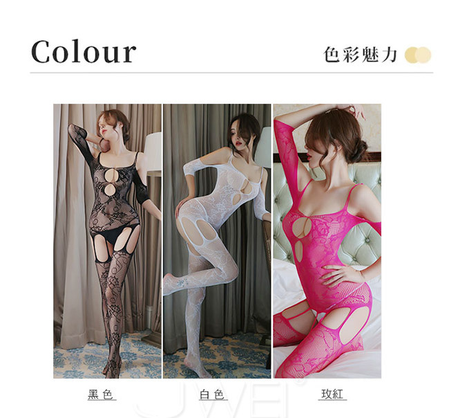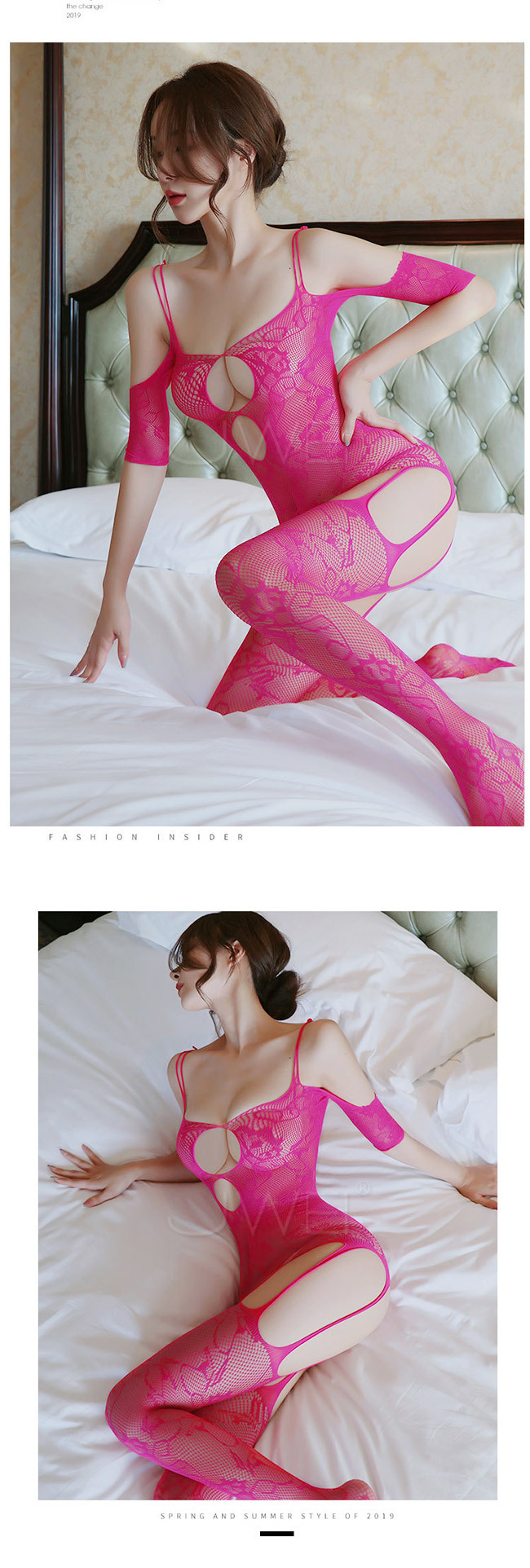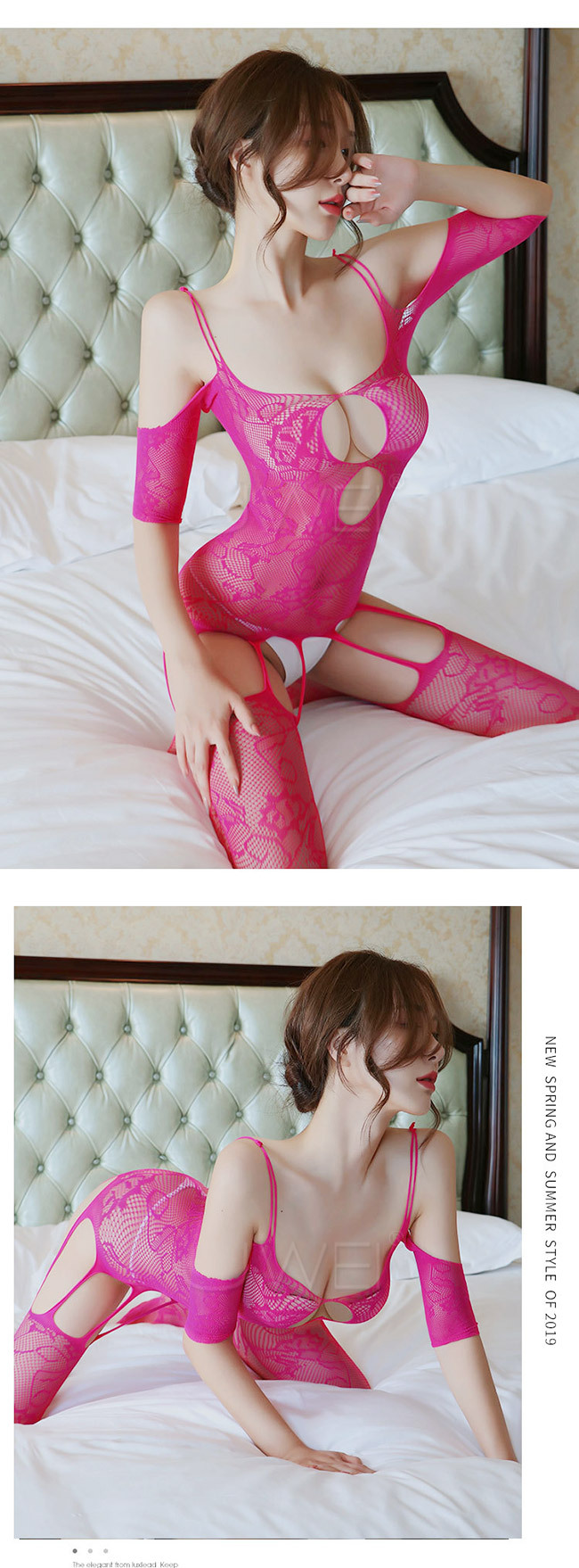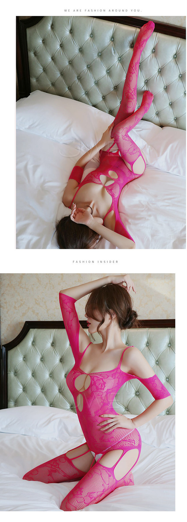 儷影蠍心.性感圓孔露胸透視一體吊襪誘惑連身貓裝(玫紅)