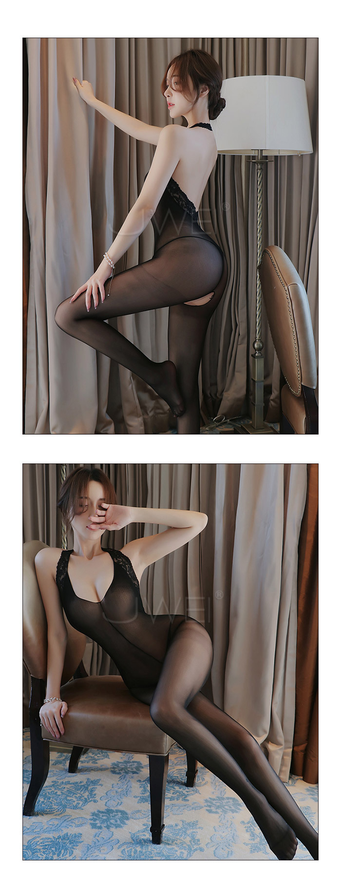 熾愛情調.迷人掛脖露背輕薄透氣火辣開檔一體式連身貓裝(黑)