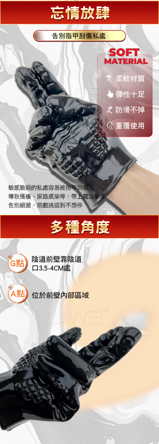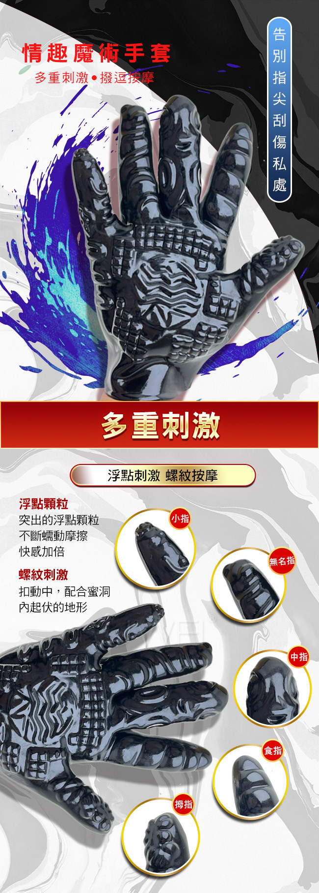 亞當斯情趣魔術手套,多重刺激,突出的浮點顆粒,不斷蠕動摩擦,快感加倍!螺紋刺激,扣動中配合蜜洞內起伏的地形撥逗按摩。告別指尖刮傷私處,敏感脆弱的私處容易被指甲刮傷,導致搔癢、尿路感染等,帶上魔法手掌,告別細菌,前戲挑逗到不想停!柔軟材質,彈性十足可重覆使用。