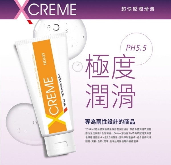 X-Crème超快感潤滑液是專爲兩性設計保持身體潤滑及增益兩性生活樂趣的配方,水溶性配方、不黏不腻、清洗方便;色澤透明晶瑩;PH值5.5弱酸性,不會刺激皮膚,就像身體自然發出的體液。配合保險套使用,效果更佳。