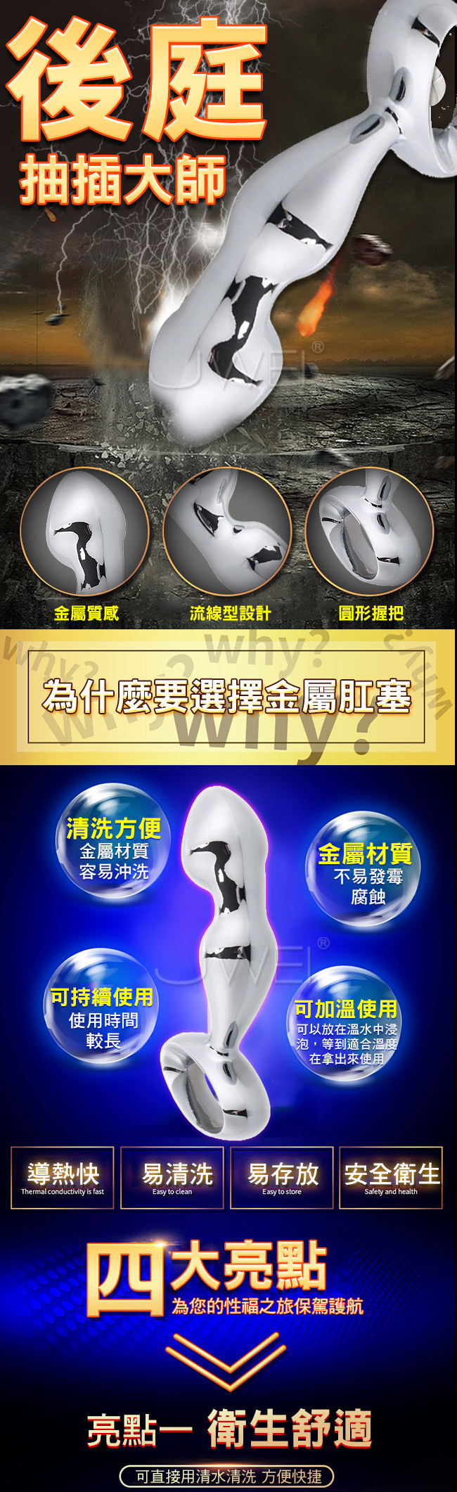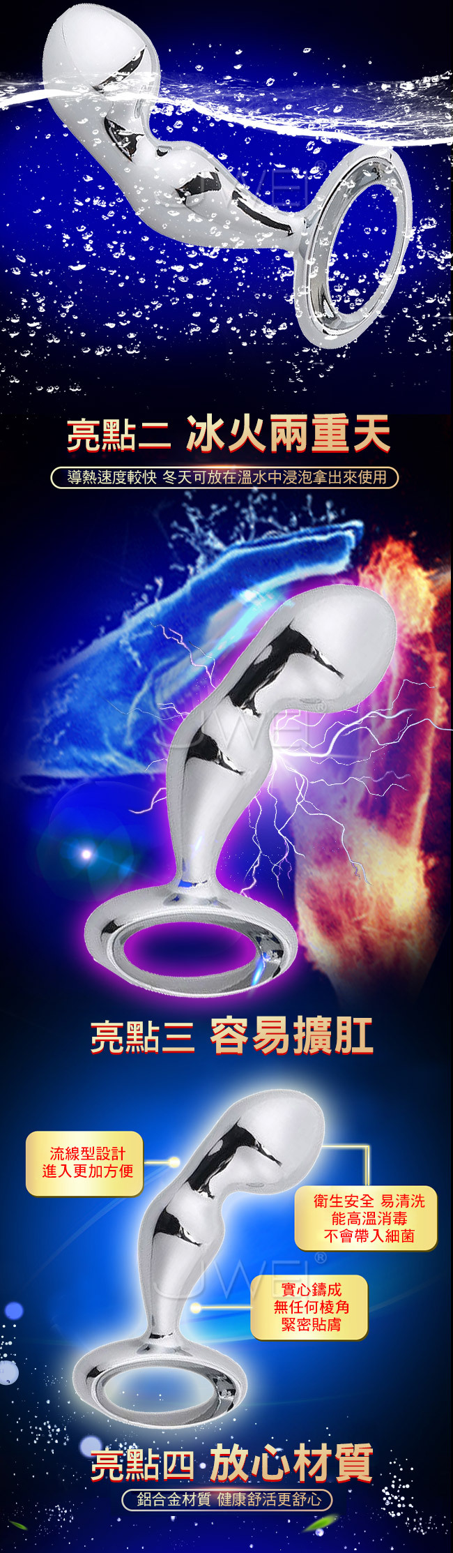 衛生金屬表面的優點是光滑,無氣孔,且易於清洗,不會藏污納垢,所設計的角度可 觸動你敏感地帶,使用起來都有不同的強烈快感。金屬材質還有一種玩法,就是可以 把它冰在冰箱中,或是先以熱水加熱,在夏天可以嘗試冰涼的快感、冬天可以嘗試溫 熱的玩法,享受冰火二重天的快感,都別有一番風味。