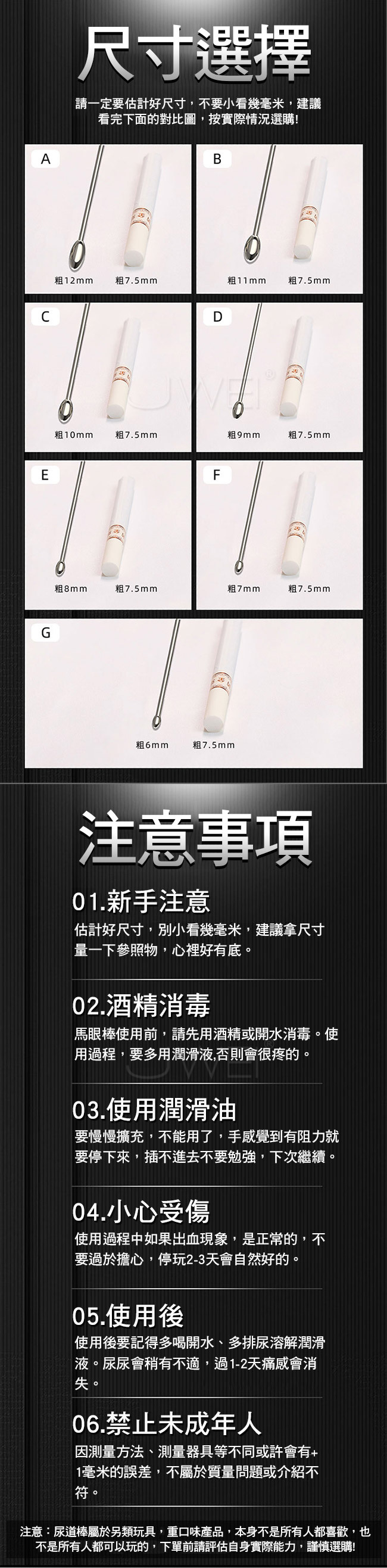 金屬馬眼棒不銹鋼材質,一體成型精細打磨圓潤光滑,重口味另類刺激,清洗方便使 用長久,存放容易;請一定要估計好尺寸,不要小看幾毫米,建議看完下面的對比圖 ,按實際情況選購!注意:尿道棒屬於另類玩具,重口味產品,本身不是所有人都喜歡 ,也不是所有人都可以玩的,下單前請評估自身實際能力,謹慎選購!