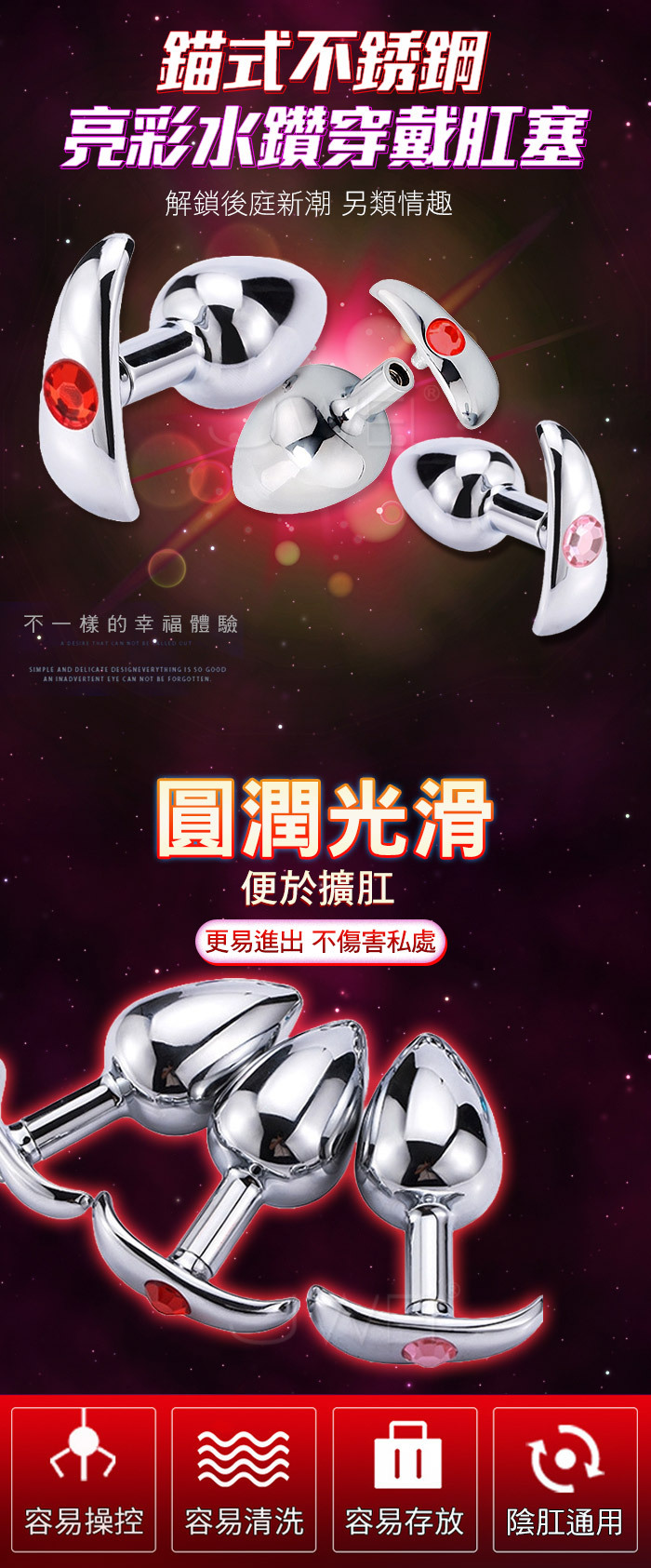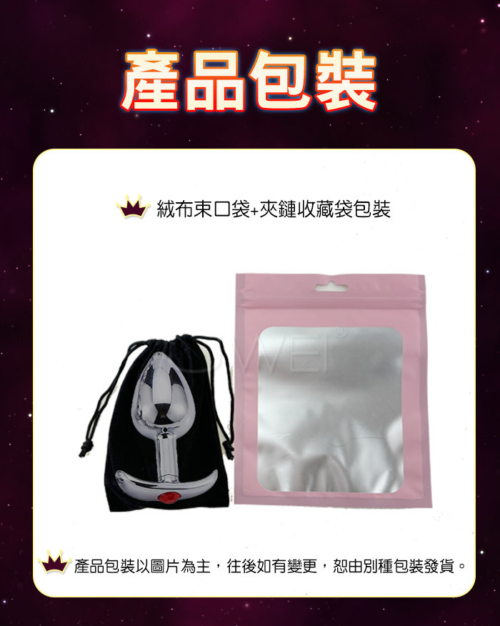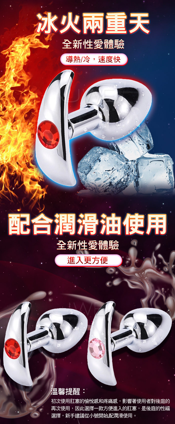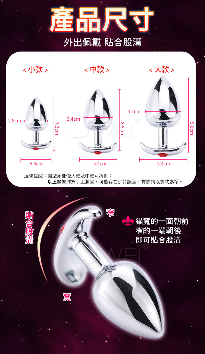 完美的曲線保持長時間的舒適,金屬的冷冽觸與重力感,加強你的敏感神經。特殊的握把,在每次的進出都與生理結構細膩的結合著,加強著身體反應!做工精美的迷你金屬肛塞,表面光滑,稍微抹些水溶潤滑劑,即可推入後庭,非常適合後庭初用者,而尾部人造鑲嵌寶石裝點著肛部,讓愛人看了立即深陷其中,欲罷不能。金屬是溫度的優良導體,如果用冷/熱水浸泡後再使用,這種與體溫的差異會帶來令人意想不到的感覺。