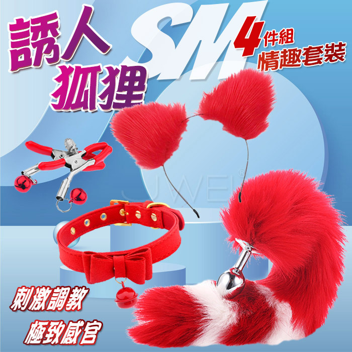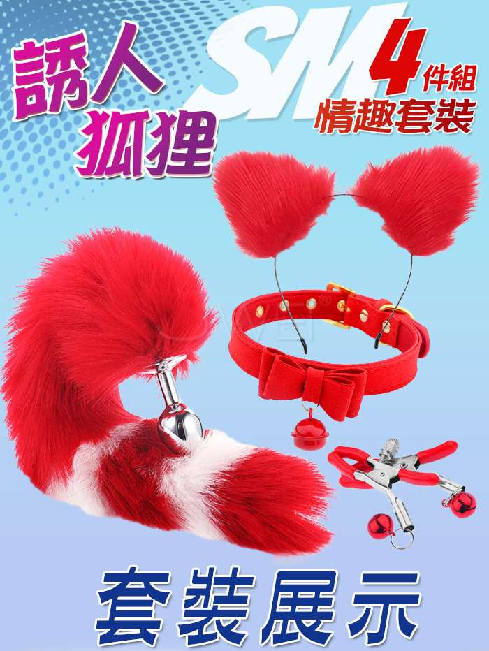 誘人狐狸.裝扮遊戲4件套組﹝狐狸尾巴+毛絨髮箍+蝴蝶頸圈+鈴鐺乳夾﹞紅色