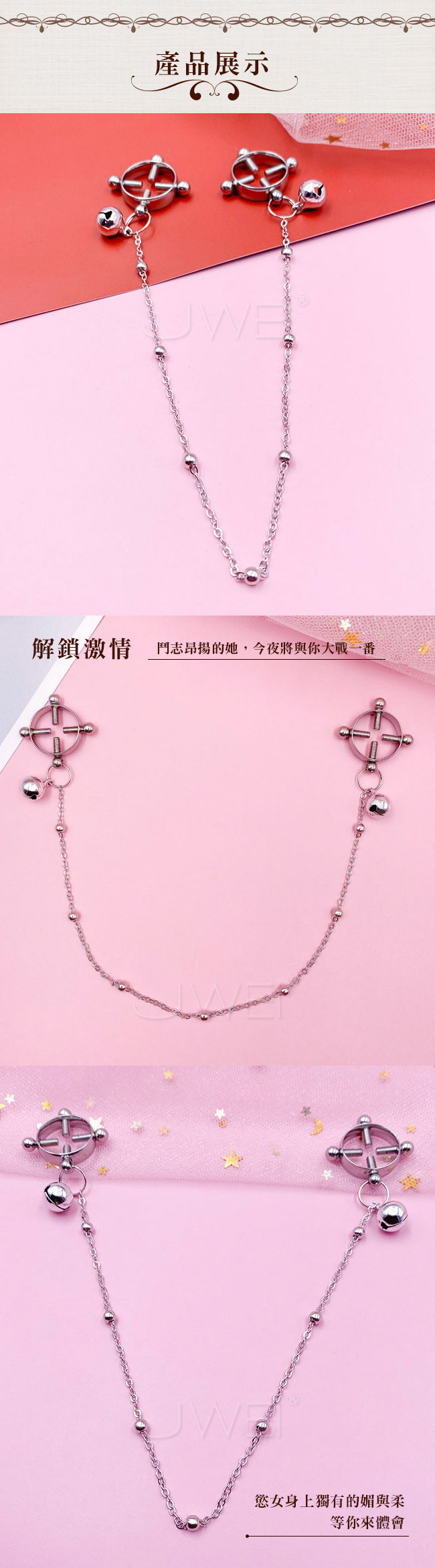 閨房情趣.狂野鈴鐺長鏈夾珠款金屬螺絲乳夾
