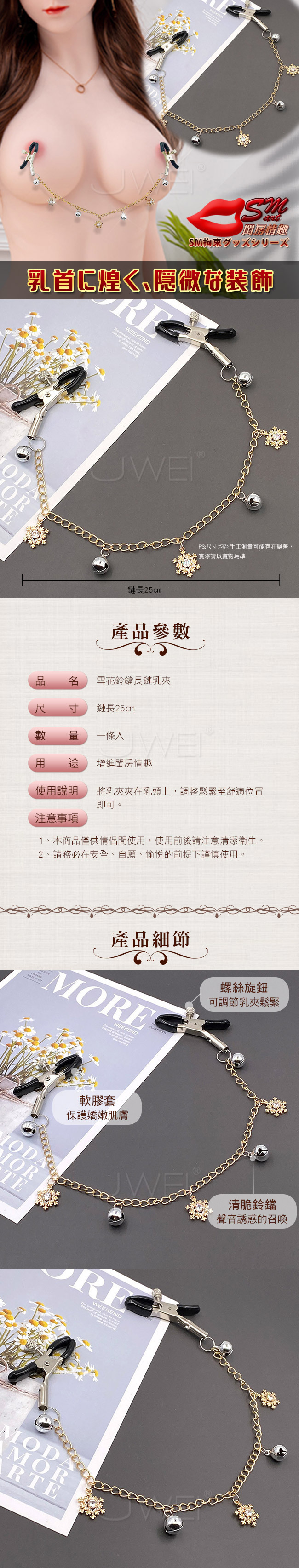 閨房情趣.浪漫雪花鈴鐺長鏈乳夾-銀色