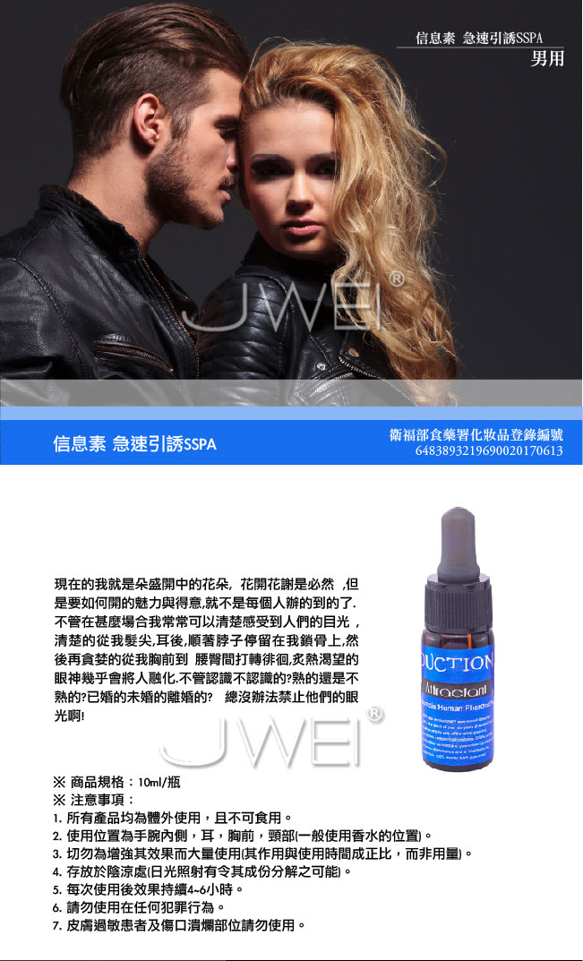 信息素神奇的魅力將帶您進入一個自由、激情、浪漫的夢幻境界。它能讓周圍的人感受到愉悅而產生微笑,更富有 詩意和情趣,讓您散發最魅力性感的氣息。