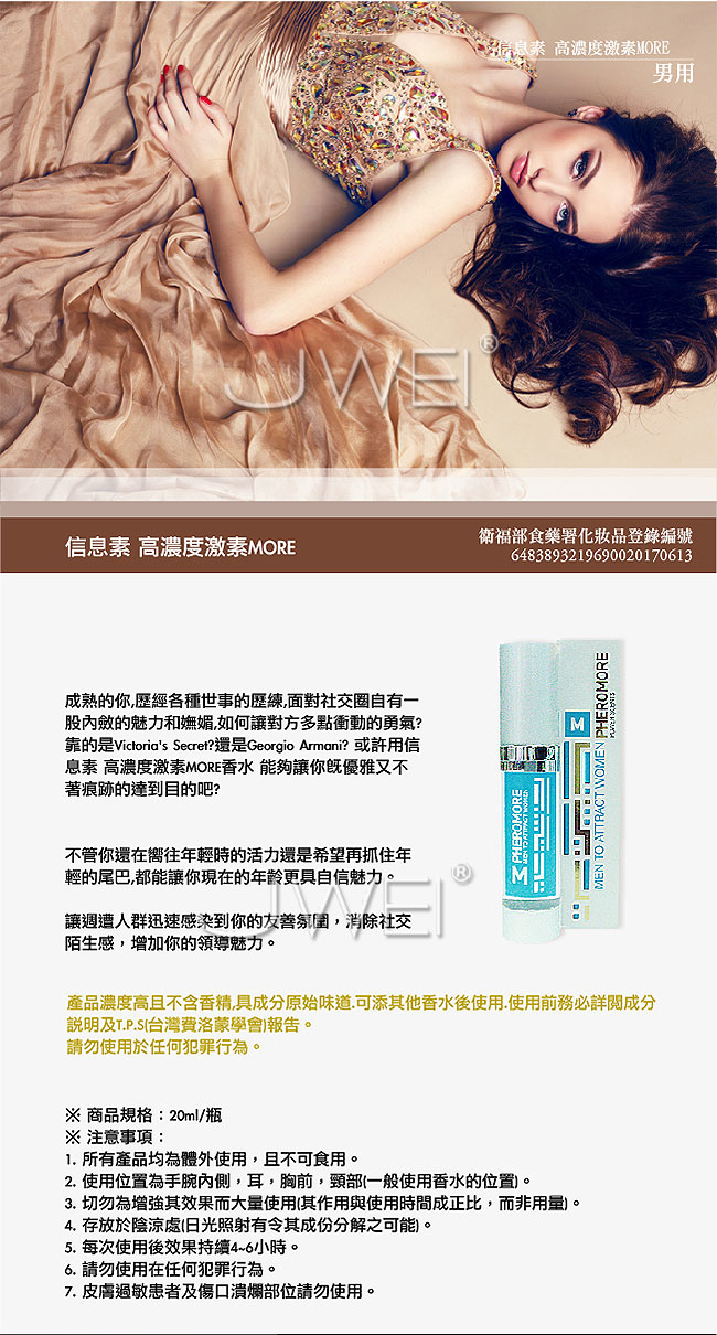 ※ 商品用途:產品中添加高單位信息素配方之濃縮液及香精於精油中,能持續散發信息素作用及芳香並增添個人魅力
